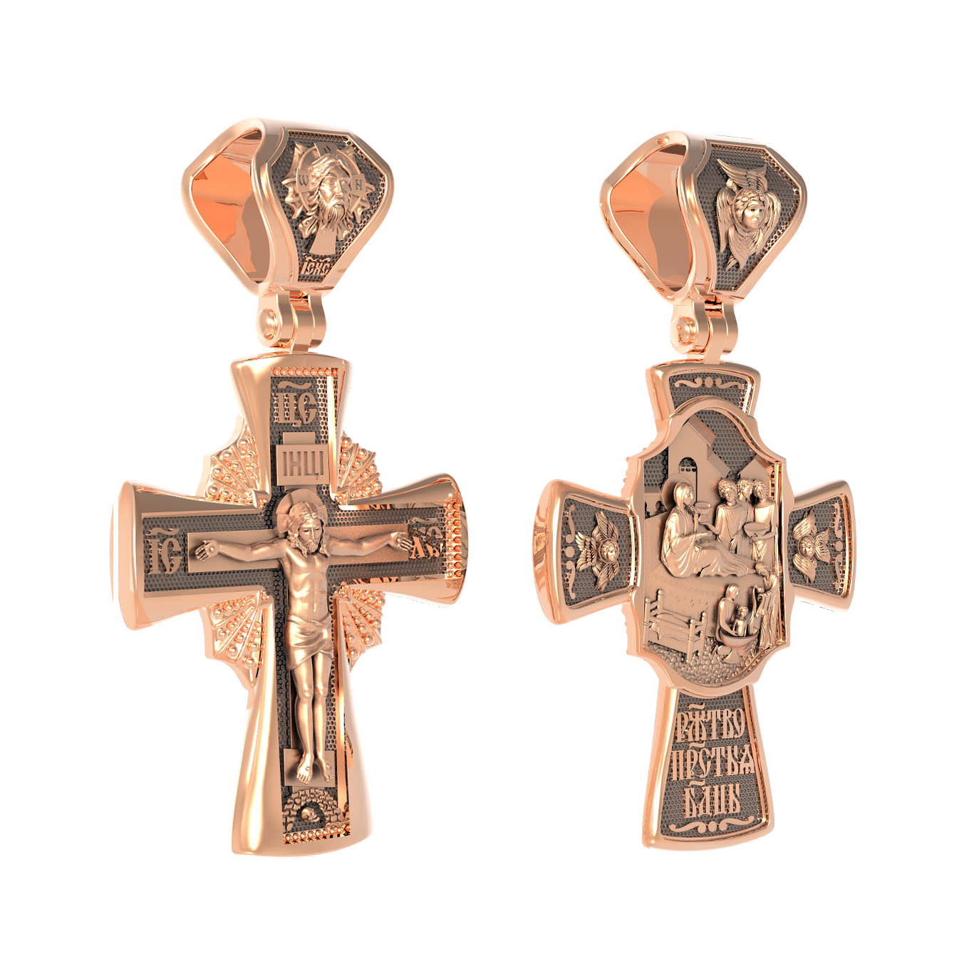 На лицевой стороне креста изображено Распятие Господа и Спасителя нашего Иисуса Христа, отдавшего Себя на смерть, для искупления грехов мира. Крест является символом жертвенной любви Всеблагого Бога к падшим людям, всепобеждающим духовным оружием христиан, основанием и средоточием церковной жизни. Господь сказал: кто хочет идти за Мною, отвергнись себя, и возьми крест свой, и следуй за Мною. (Мк. 8: 34). Над Распятием помещена надпись «Царь Славы». На верхней табличке, выше головы Иисуса, расположена надпись, составленная Понтием Пилатом — «IНЦI». Она означает «Иисус Назорей, Царь Иудейский». Надпись «IC» «ХC», означает Иисус Христос, помещается на разных сторонах поперечной перекладины креста. Возвышение, на котором стоит Крест, символизирует гору Голгофу, на которой произошло Распятие. Под подножием Креста изображена покоящаяся голова (череп) Адама. На кулонном кольце изображен Нерукотворный образ Господа и Спасителя нашего Иисуса Христа, чудесно отпечатавшийся на плате, которым Христос вытер свой лик. Ниже надпись — «IC» «ХC».
