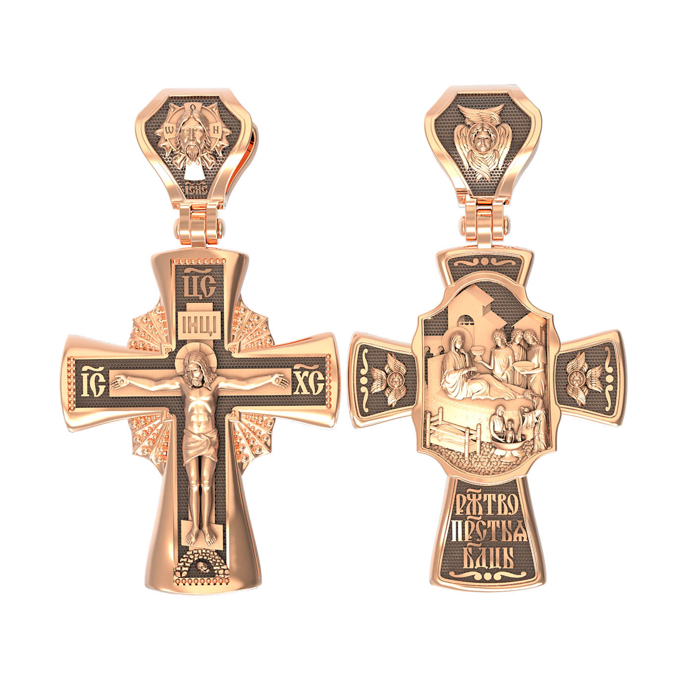 На оборотной стороне креста изображена икона Рождество Пресвятой Богородицы. Согласно церковному Преданию, Пресвятая Дева Мария родилась в небольшом галилейском городе Назарете. Родителями Её были праведные Иоаким и Анна. Супруги были бездетны, но не теряли надежды, что Господь может разрешить неплодство Анны даже в её преклонном возрасте. Они горячо молились и просили Господа даровать им дитя, которое обещали посвятить Богу для служения в храме. И Господь услышал их молитвы: Праведная Анна зачала и разрешилась дочерью Марией — будущей Пресвятой Богородицей. На кулонном кольце изображен шестикрылый Ангел — Серафим.