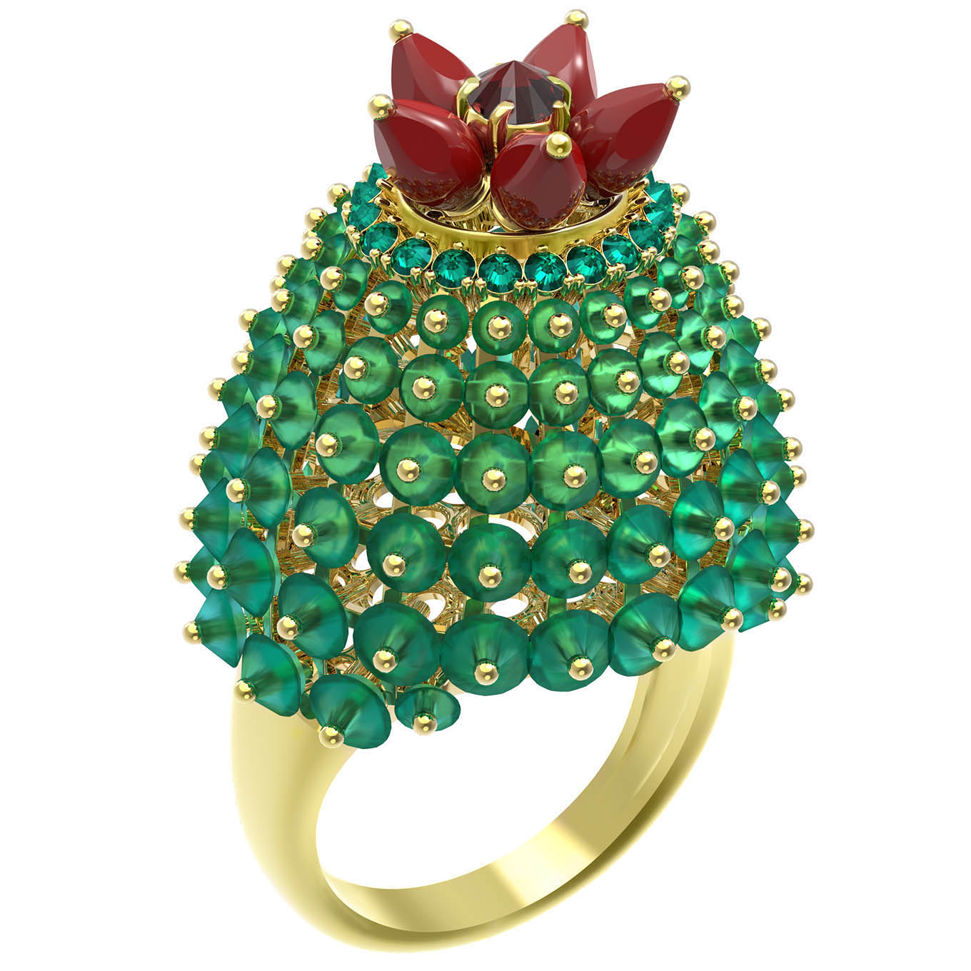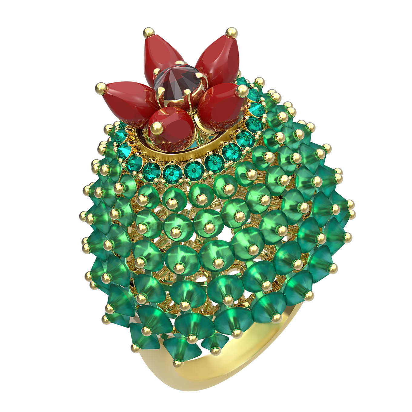 Кольцо из лимонного золота c гранатом, хризопразом, изумрудом и кораллом