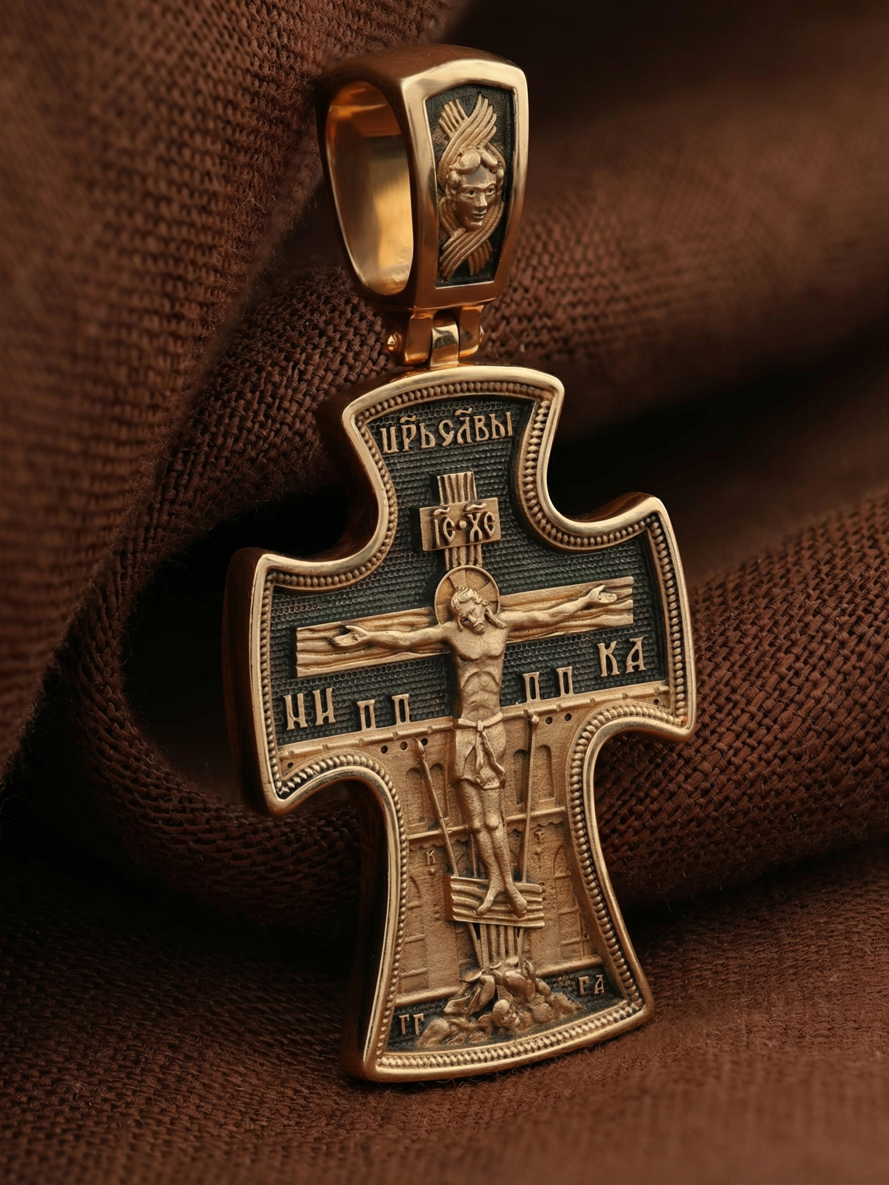 Оборотную сторону креста возглавляет икона святителя Николая Чудотворца, которого еще называют Николай Угодник за то, что он угодил своей жизнью Богу. Николай Чудотворец, помощник в делах, покровитель учащихся, утешитель обиженных. Также Святитель Николай Чудотворец известен своими молитвами за путешественников, когда непрестанный ветер и бушующие волны утихают и корабль заходит в спокойную гавань. На кулонном кольце изображен Спас Нерукотворный — Символ вочеловечившегося Божества и четырехкрылый Херувим.