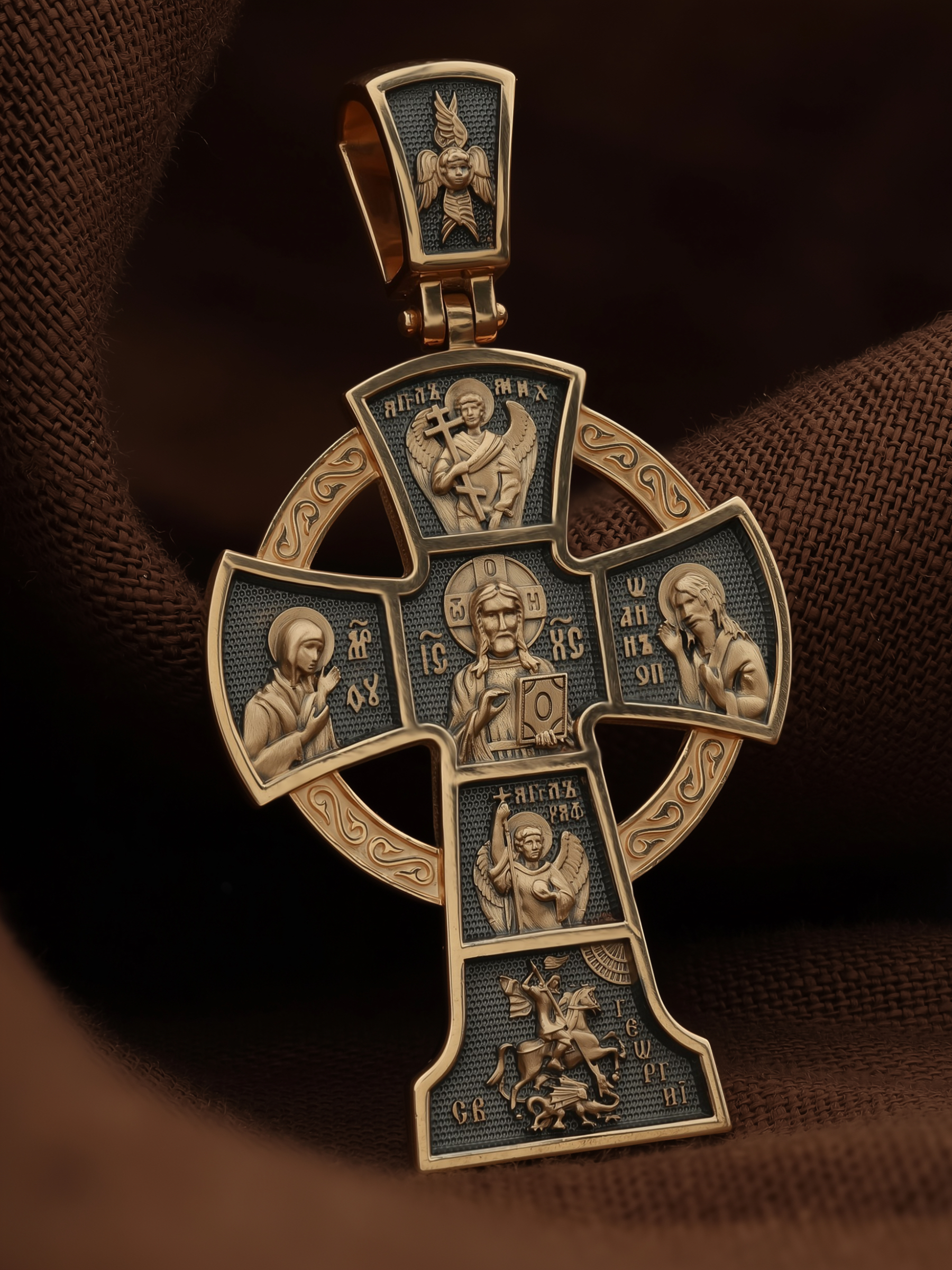 Вверху и внизу от спасителя предстоят два архангела, Михаил (Первый служитель Божественной славы, страж и защитник) и Гавриил (служитель Божественной крепости и изъявитель сокровенных Божьих тайн). Внизу помещен образ свт. Георгия Победоносца. Святой при жизни прославился не только как храбрый воин и твердый исповедник веры, но и как сострадательный, милосердный целитель и чудотворец. Святому молятся о покровительстве воинам и армии, о защите государства, сохранении и спасения России.