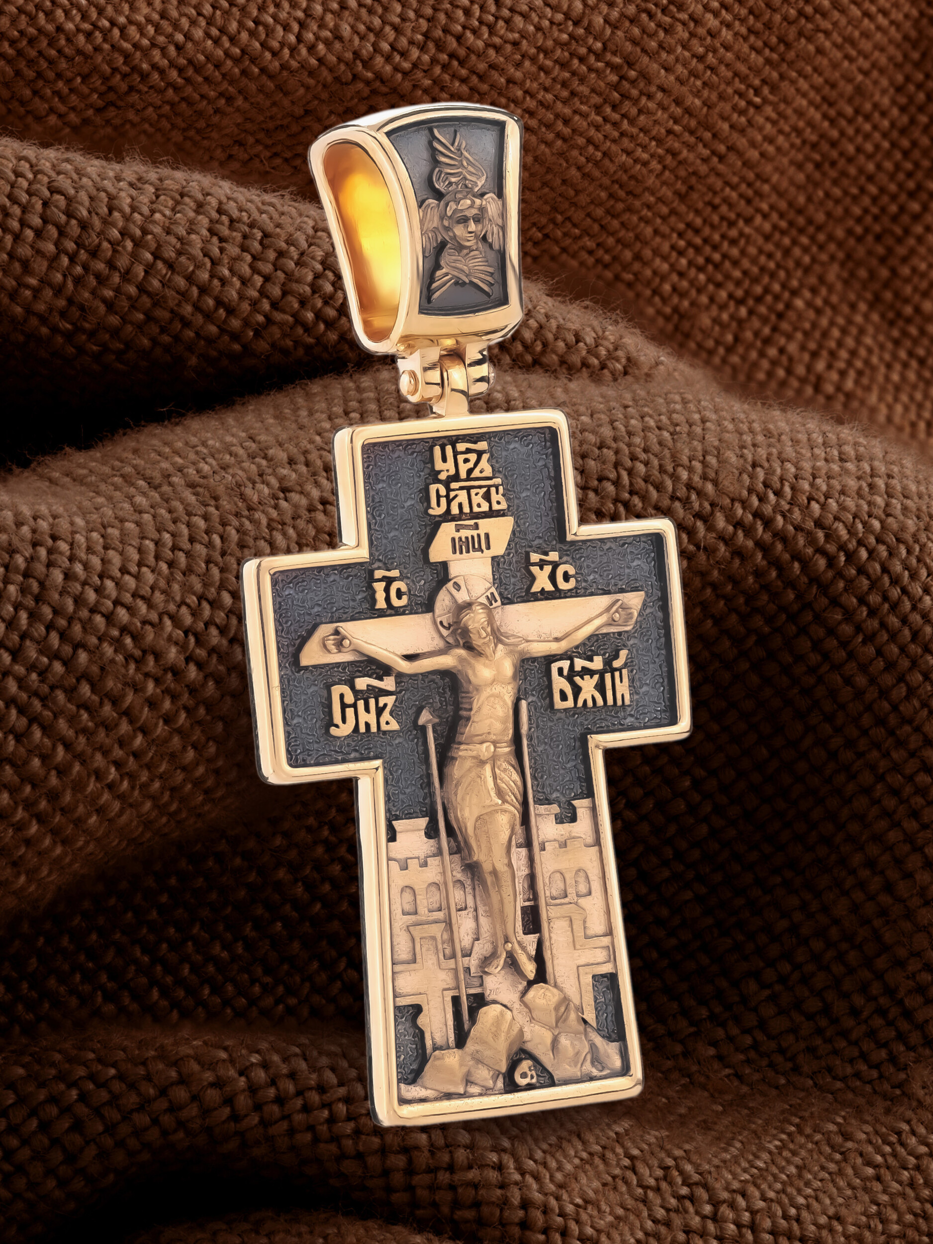 В центре оборота креста изображен Архистратиг Михаил. Могучий Архангел почитается как покровитель воинов и всех верных Богу и ведущих борьбу против сил зла, а также защитник душ умерших, страж райских врат. Вокруг его образа написаны слова: «Небесного царя страшный, грозный, сильный, крепкий небесных сил воевода Архистратиг Михаил».На кулонном кольце изображен Спас Нерукотворный — Символ вочеловечившегося Божества и шестикрылый Серафим — самый приближенный к Господу Ангел.