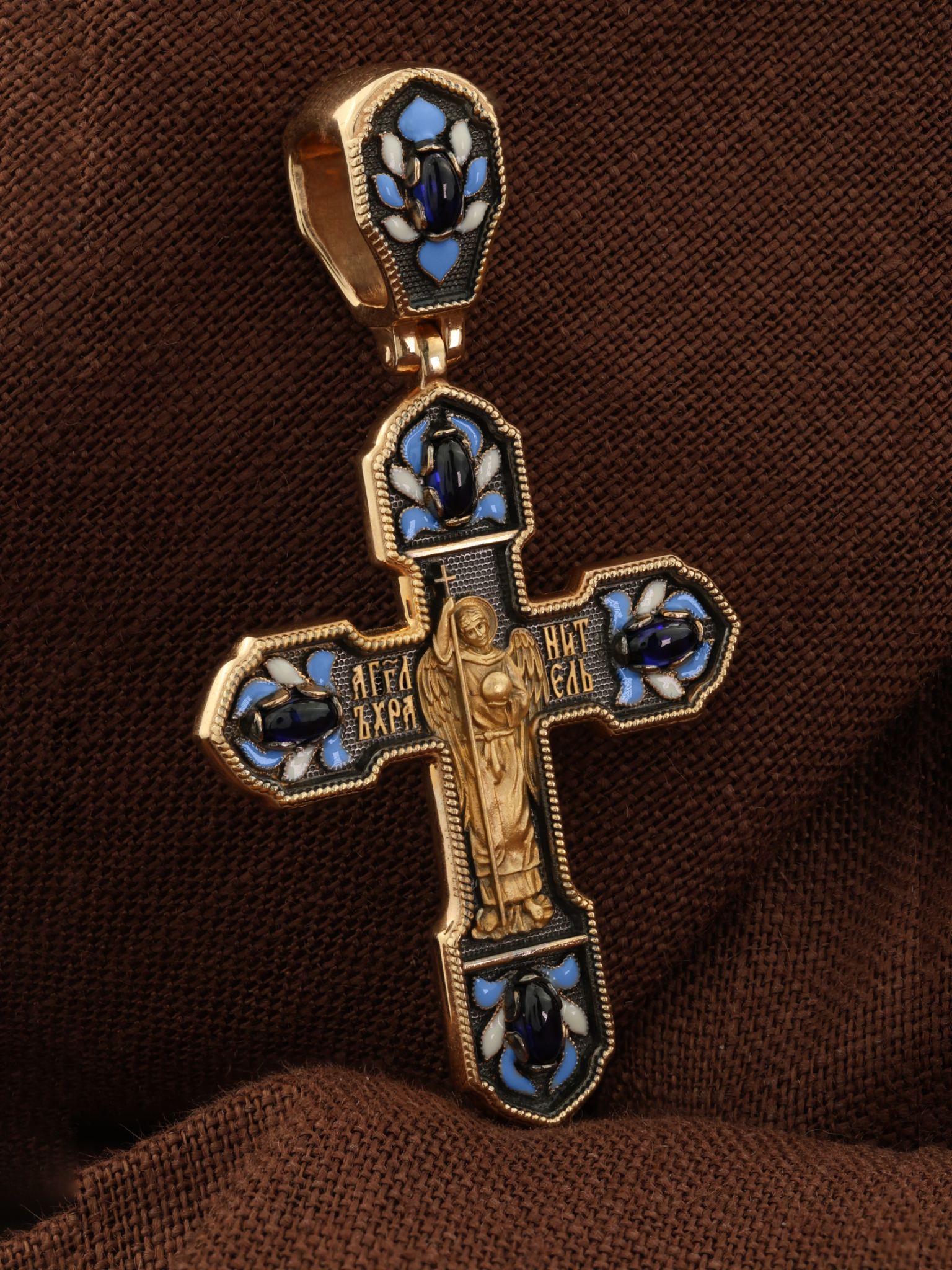 Крест из золота c эмаль и сапфиром