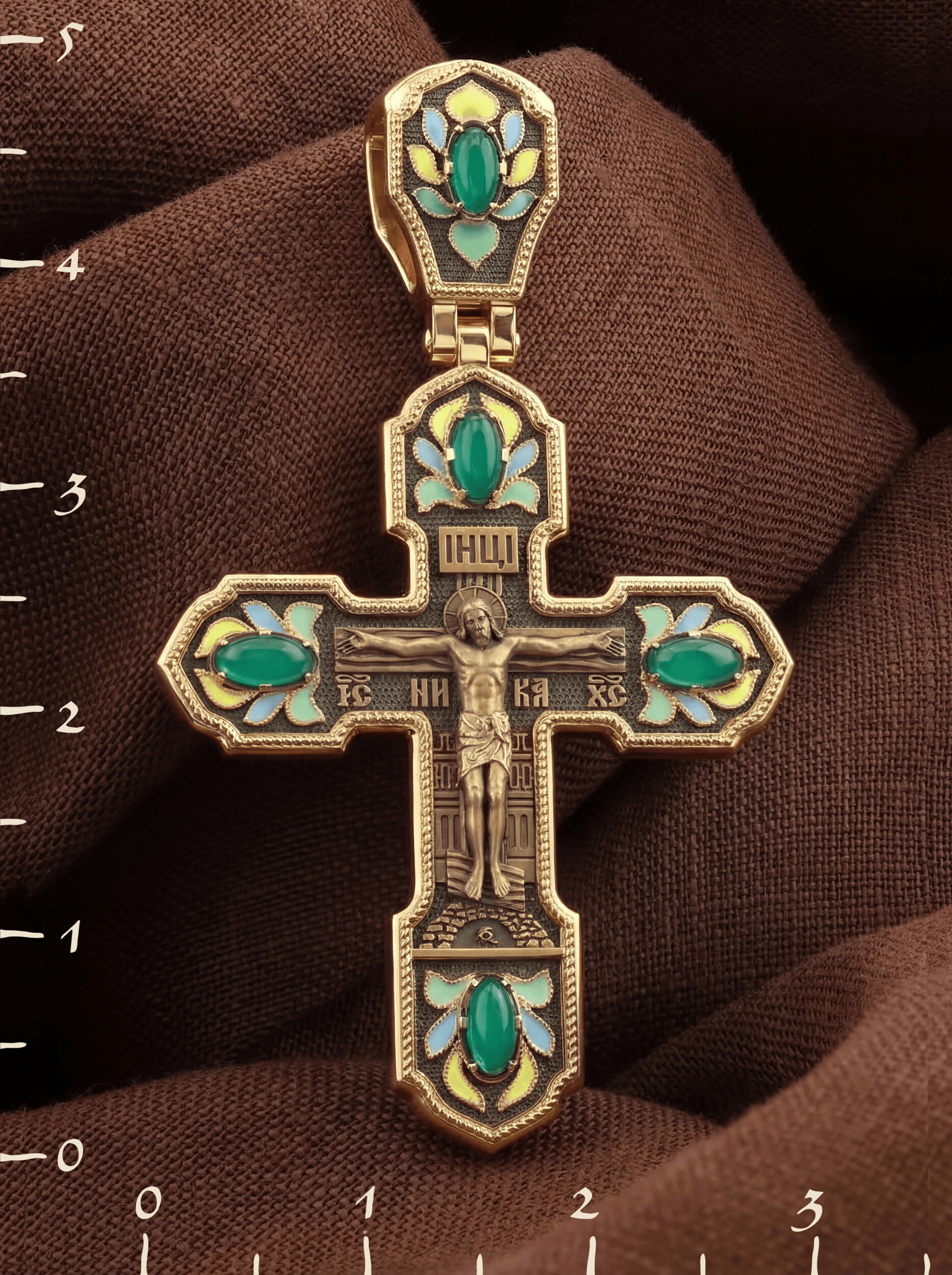 В верхней части Распятия у изголовья Иисуса Христа видна табличка с аббревиатурой «IНЦI» — «Иисус Назорей Царь Иудейский», которая, согласно Евангелию, была прибита к кресту после Его Распятия. Внизу, у подножия Господа, можно увидеть гору Голгофу с Главой Адамовой в пещере. Сам образ Распятия сопровождается каноническими надписями. Это святое имя Христа, которое принято писать на иконах сокращенно — «ИС ХС», словосочетание «СЫН БОЖИЙ», что означает божественную природу Иисуса Христа, и надпись «НИКА», обозначающая «победитель».