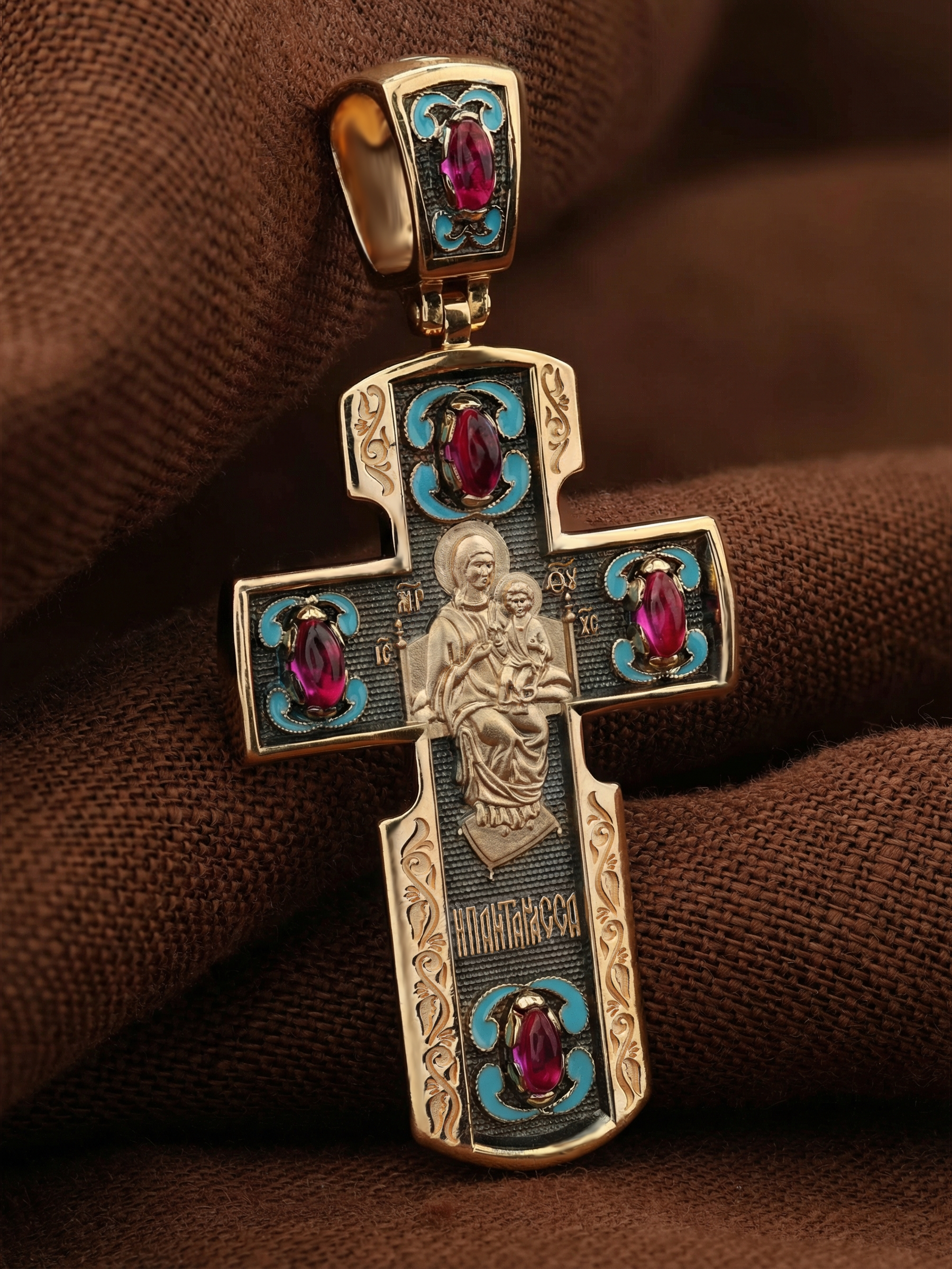 На оборотной стороне креста изображена икона Божией Матери «Всецарица» или «Пантанасса», на которой Пресвятая Богородица восседает на царском троне. На руках Ее — Богомладенец Христос со свитком в левой руке и благословляющий десницей. Правой рукой Богородица указывает на Своего Царственного Сына, как на Спасителя мира. Чудотворная икона была написана в XVII веке и находится на Святой Горе Афон, в одном из древних греческих монастырей — Ватопеде. По молитвам перед иконой совершается множество чудесных исцелений. Пречистая Богородица наставляет на праведный путь, помогает укрепить веру, найти утешение.