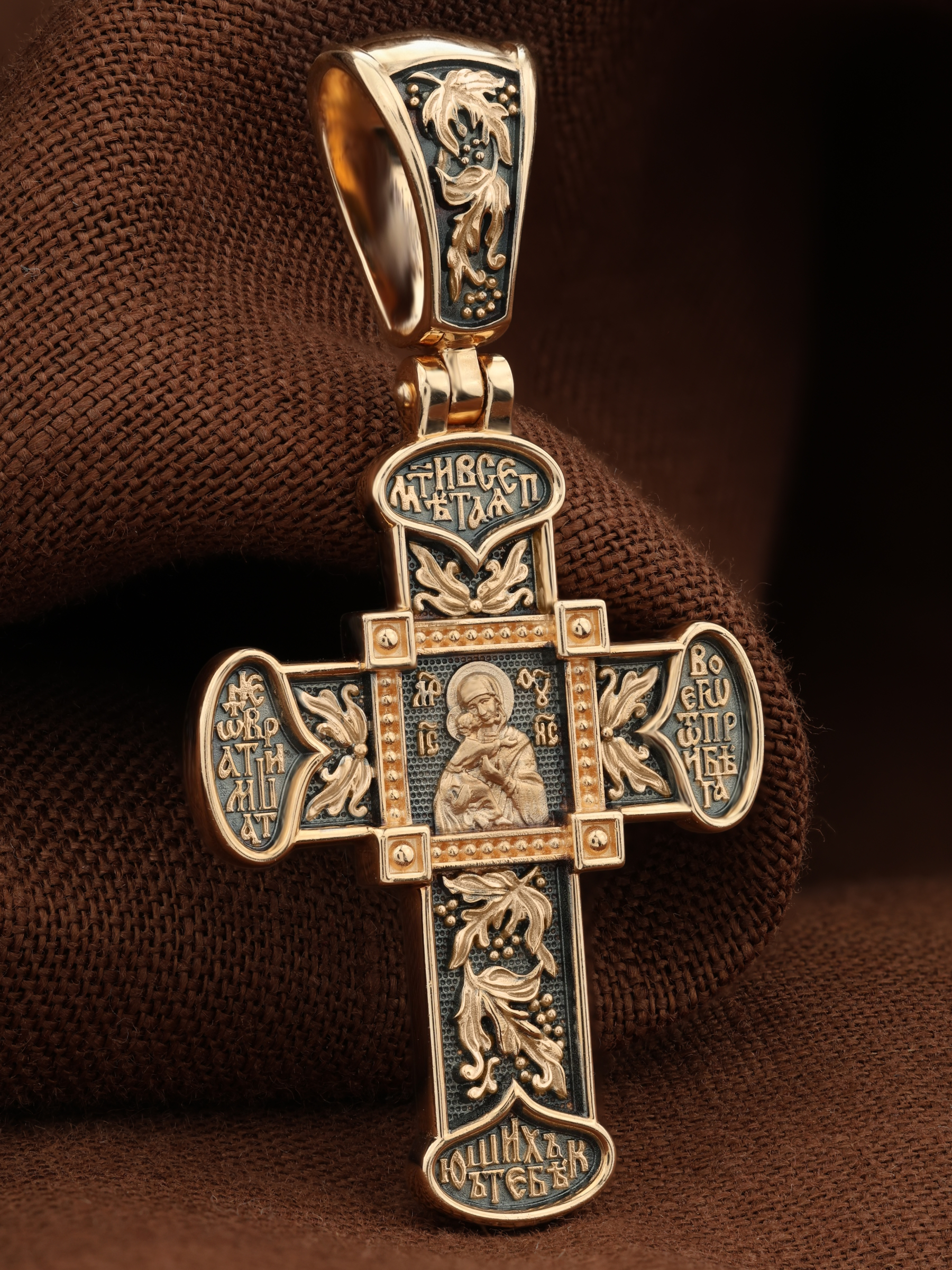 В центре оборотной стороне креста помещен образ Владимирской иконы Божией Матери — один из самых чтимых святынь Русской православной церкви. По преданию, икона была написана Святым апостолом и евангелистом Лукой во время земной жизни Богородицы. Дева Мария, увидев Свое изображение, молвила: «Отныне ублажат Мя вси роди. Благодать Рождшегося от Меня и Моя с сим образом да будет». Образ написан в лирическом иконографическом типе «Умиление». Младенец припал щекой к щеке Матери и тянется к ней правой рукой, другой нежно обнимая за шею. Икона Владимирской Божией Матери вплоть до V века находилась в Иерусалиме, затем была перевезена в Византию. На Русь икона была привезена в 1131 г. За прошедшие столетия святыня неоднократно переезжала из Владимира в Москву и обратно, не раз спасая страну от захватчиков. Русская Православная Церковь установила троекратное празднование Владимирской иконе Божией Матери. Каждый из дней празднования связан с избавлением русского народа от порабощения иноплеменниками по молитвам ко Пресвятой Богородице. В последующие века у иконы происходили многие важные исторические события: подписание актов, принятие присяги значимых государственных деятелей и возведение на престол. Вокруг образа, по сторонам Креста, написана молитва: «Мати Всепетая, не отврати лица Твоего от прибегающих к Тебе». Оборотная сторона креста украшена растительным орнаментом.