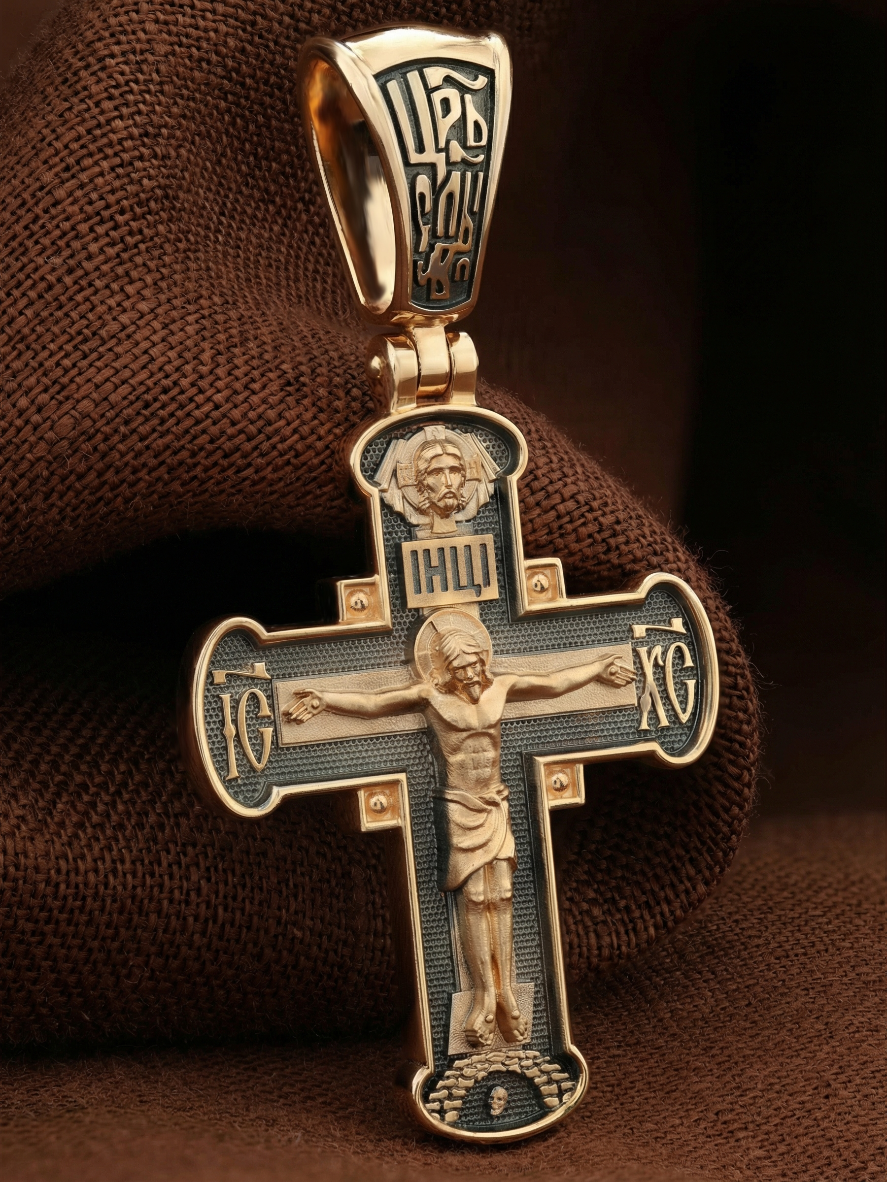 На лицевой стороне креста изображено Распятие Господа и Спасителя нашего Иисуса Христа, отдавшего Себя на смерть, для искупления грехов мира. Крест является символом жертвенной любви Всеблагого Бога к падшим людям, всепобеждающим духовным оружием христиан, основанием и средоточием церковной жизни. Господь сказал: «кто хочет идти за Мною, отвергнись себя, и возьми крест свой, и следуй за Мною». (Мк. 8: 34). На кулонном кольце помещена надпись «Царь Славы». На верхней табличке, выше головы Иисуса, расположена надпись, составленная Понтием Пилатом — «IНЦI». Она означает «Иисус Назорей, Царь Иудейский». Над ней — Нерукотворный образ Господа и Спасителя нашего Иисуса Христа, чудесно отпечатавшийся на плате, котором Христос вытер свой лик. Надпись «IC» «ХC», означает Иисус Христос, помещается на разных сторонах поперечной перекладины креста. Крест стоит на горе камней, символизирующих Голгофу. В ее основании различается череп– это голова Адама.