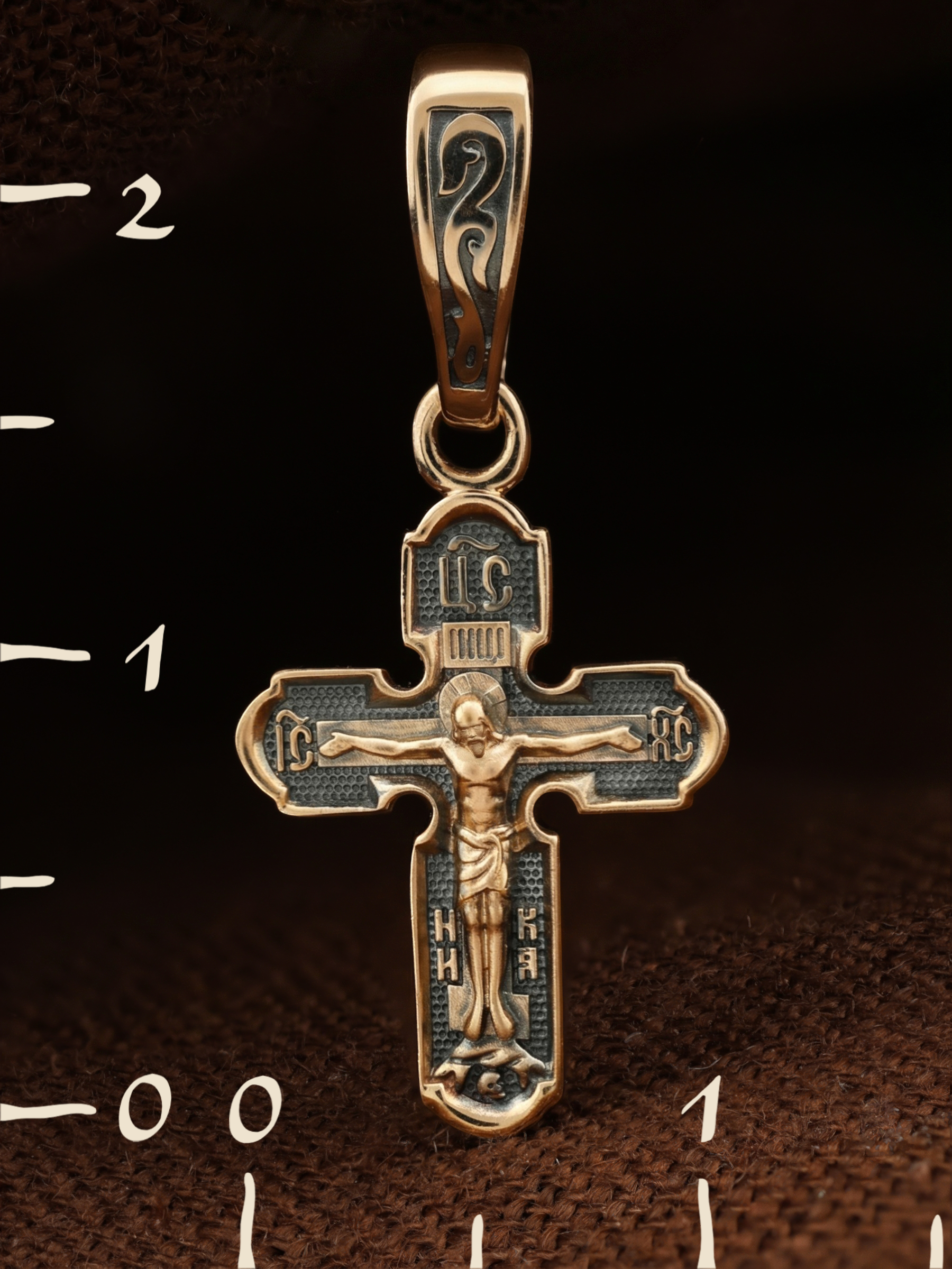 На лицевой стороне креста изображено Распятие Господа и Спасителя нашего Иисуса Христа, отдавшего Себя на смерть для искупления грехов мира. Крест является символом жертвенной любви Всеблагого Бога к падшим людям, всепобеждающим духовным оружием христиан, основанием и средоточием церковной жизни. Над вершиной Распятия помещена надпись «Царь Славы». На верхней перекладине расположена надпись «IНЦI». Она символизирует титло — табличку, на которой, согласно Евангелию, было начертано: Иисус Назорей, Царь Иудейский. Надпись «IC» «ХC»», означает Иисус Христос, помещаются на разных сторонах поперечной перекладины креста. Ниже помещена надпись «НИКА», что означает «победитель». Крест стоит на горе камней, символизирующих Голгофу. Под подножием Креста изображена покоящаяся голова (череп) Адама.