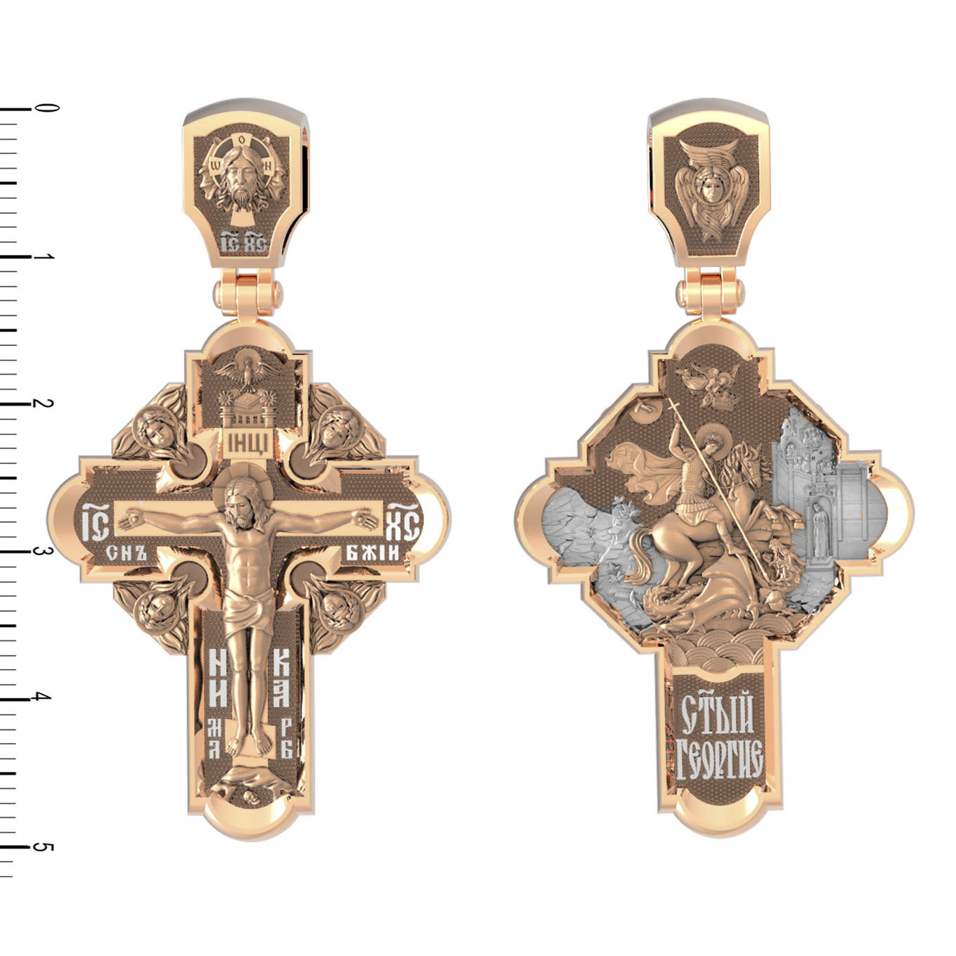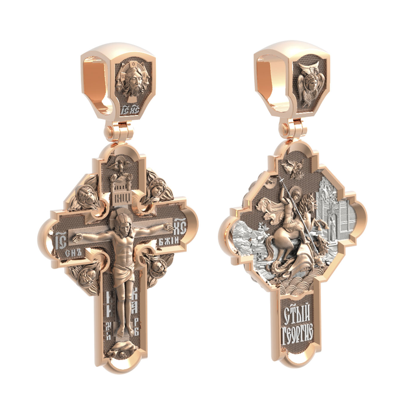 На оборотной стороне креста помещено изображение Святого Великомученика Георгия Победоносца — одного из самых почитаемых и удивительных святых. Георгий родился в Каппадокии (Малая Азия) в семье богатых и знатных горожан. Юношей поступил на службу к римскому императору Диоклетиану, за отличное знание военного дела и проявленную в боях и походах храбрость был приближен к императору и удостоен высокого воинского звания. Во время начавшихся гонений на христиан, перешел на сторону гонимых и, отвергнув человеческий страх, стал ярым проповедником учения Христа. Мучители подвергли опального воеводу жесточайшим восьмидневным пыткам и казнили его (обезглавили) в возрасте около тридцати лет в 303 году. Георгий изображен как воитель, сидящий на вздыбленном коне и поражающий копьем огнедышащего змея. Слева над образом изображена благословляющая Божия десница. Над святым изображен ангел возлагающий на него венец мученика. Змей символизирует собою сатанинские силы. Молитвами вознесенными к Всевышнему и своей непреклонной верой он смог одолеть чудовище. Святой убил змея, спас царскую дочь, принесенную в жертву, и жителей города, их души от влияния дьявола, породив в них надежду и веру в Господа, призывая людей принять христианскую веру. На кулонном кольце изображен шестикрылый Ангел — Серафим.