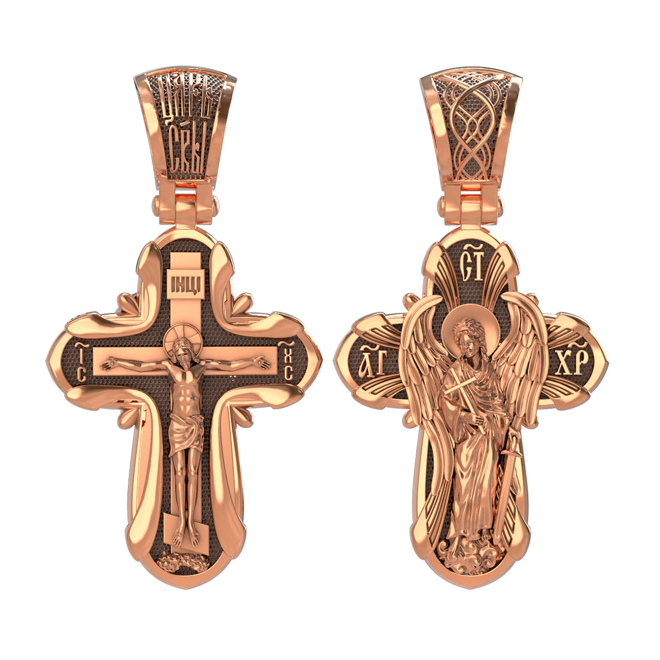 На оборотной стороне креста изображен Святой Ангел-Хранитель держащий в правой руке крест, а в левой — мечь.. Ангел-Хранитель — это Ангел приставляемый Богом к человеку при крещении для охраны и помощи в добрых делах. Он невидимо находится при человеке на протяжении всей его жизни, если человек сохраняет в себе любовь к Богу и истинную веру перед Ним. Ангел-Xранитель делают для нас все, что служит к истинному нашему благу и спасению. Невидимо пребывая при нас постоянно, он, руководствуя нас ко спасению, не только по нашему желанию таинственно наставляет нас на все доброе и полезное, не только возносит наши молитвы к Богу, но еще и сам от себя охраняют и защищают нас от врагов видимых и невидимых и ходатайствует за нас пред Богом. Ангел-Хранитель так любит нас, как никто на земле любить не может. Ангел-Хранитель — присный друг наш, незримый тихий собеседник, пресладостный утешитель. Одного лишь каждому из нас он желает — спасения души; к этому он направляет все свои заботы. И если видит нас также заботящимися о спасении, радуется, если же видит нас пребывающими в нерадении о душе своей, скорбит. Но и самый великий грешник может примириться со своим Ангелом-Хранителем посредством искреннего раскаяния в грехах и оставления их навсегда. В таком случае, по слову Писания, великая радость бывает для всех ангелов на небесах (Лк. 15:10).