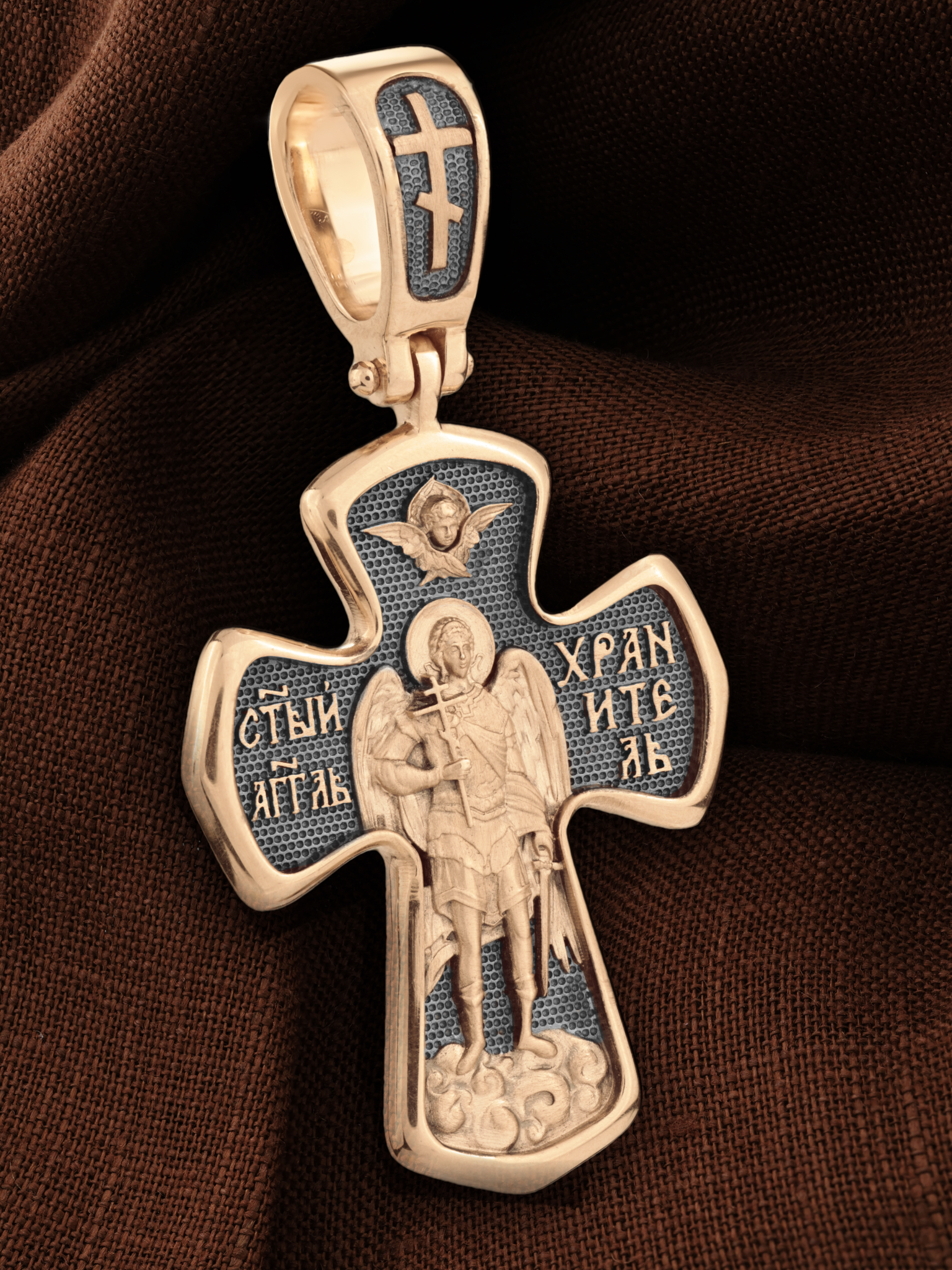 На оборотной стороне креста изображен Святой Ангел-Хранитель держащего в правой руке крест, а в левой — мечь. Ангел-Хранитель — это Ангел приставляемый Богом к человеку при крещении для охраны и помощи в добрых делах. Он невидимо находится при человеке на протяжении всей его жизни, если человек сохраняет в себе любовь к Богу и истинную веру перед Ним. Ангел-Xранитель делают для нас все, что служит к истинному нашему благу и спасению. Невидимо пребывая при нас постоянно, он, руководствуя нас ко спасению, не только по нашему желанию таинственно наставляет нас на все доброе и полезное, не только возносит наши молитвы к Богу, но еще и сам от себя охраняют и защищают нас от врагов видимых и невидимых и ходатайствует за нас пред Богом. Одного лишь каждому из нас он желает — спасения души; к этому он направляет все свои заботы. Над образом помещен Серафим.