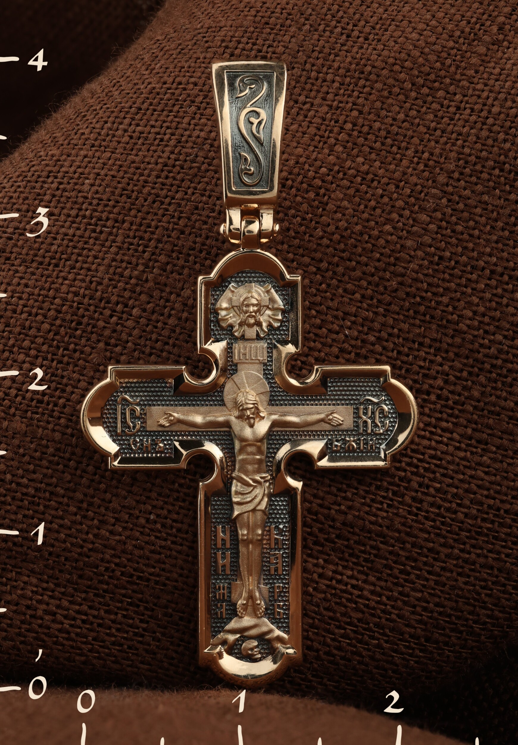 На лицевой стороне нательного креста по традиции изображено Распятие Господа нашего Иисуса Христа. Крест Господень стоит на небольшом каменистом возвышении, символизирующем гору Голгофу, которая обозначена буквами МЛРБ (Место Лобное Рай Бысть). Над головой Господа на поперечной перекладине написано «ИНЦИ», что символизирует табличку, которая была прибита к Кресту, с надписью «Иисус Назорей Царь Иудейский». Этим иудеи хотели посмеяться над Христом, не зная, что распинают истинного Царя всех царей. По сторонам основной перекладины расположены позолоченные рельефные инициалы Христа «ИС ХС». Под перекладиной, по сторонам древа, находится надпись «СЫН БОЖИЙ», а в основании креста — надпись «НИКА» (Победитель).