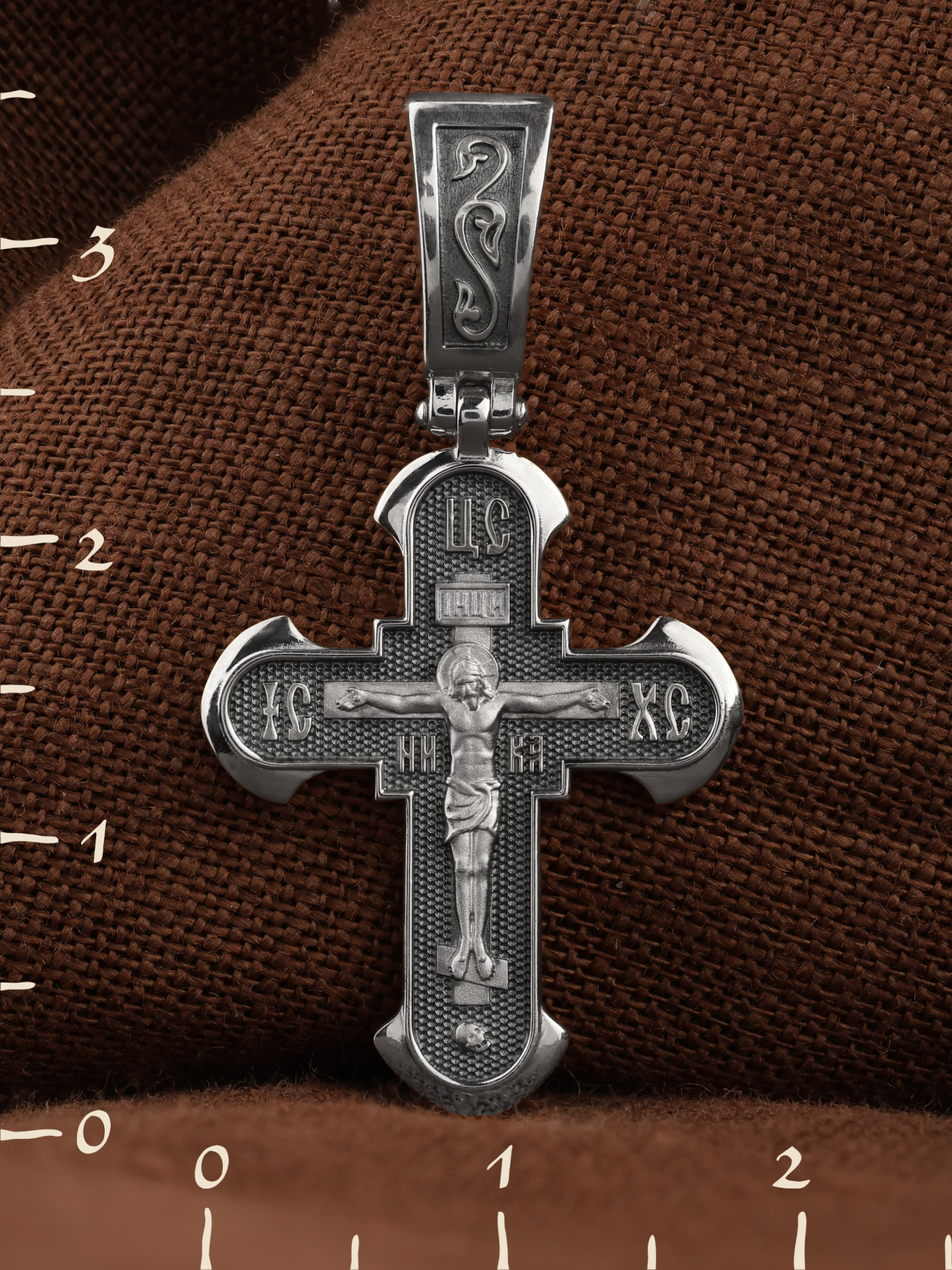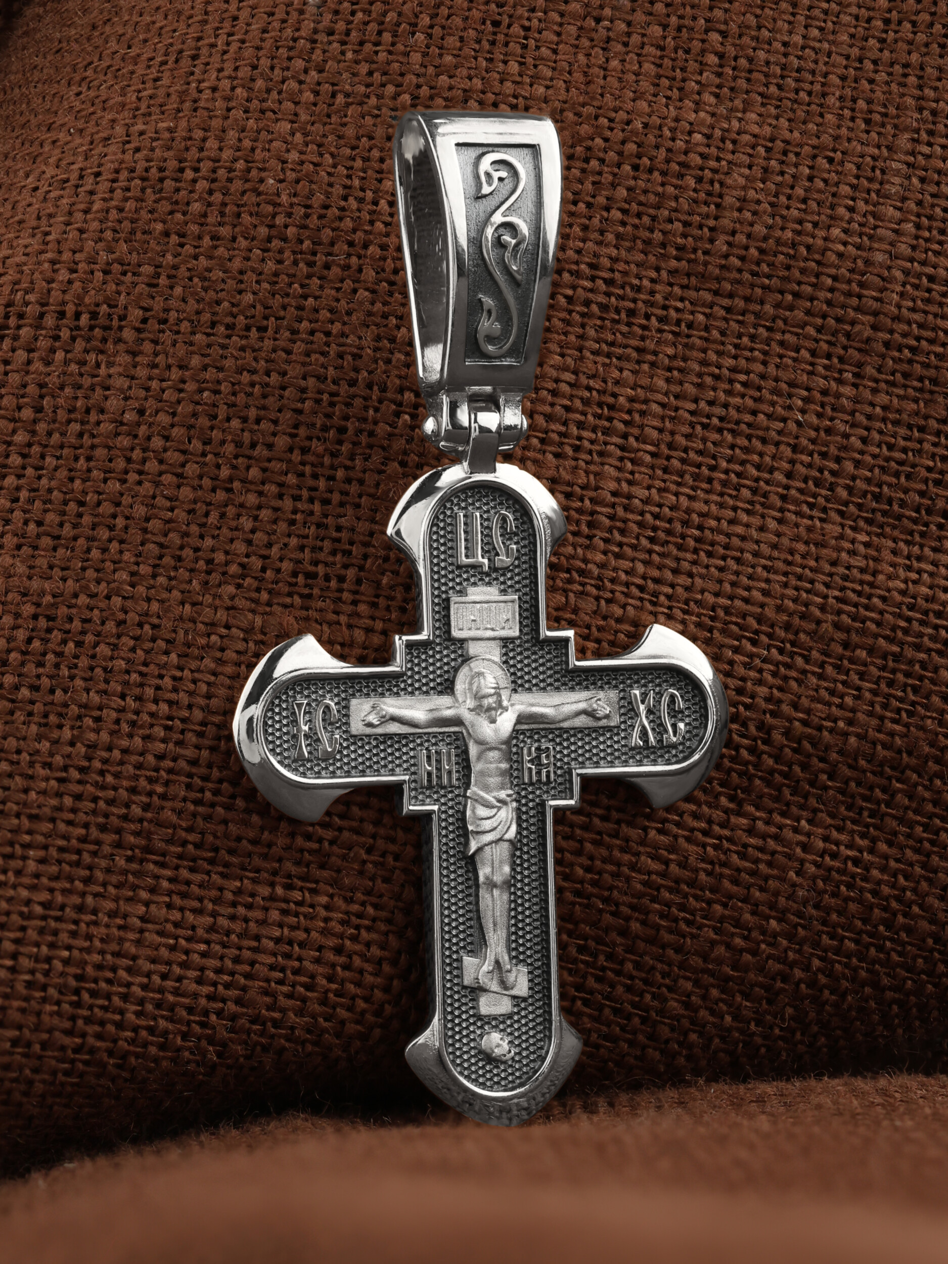 На лицевой стороне креста изображено Распятие, потому что это орудие казни Иисус Христос сделал орудием победы над грехом и смертью. Своими страданиями Он искупил грехи человечества, умерев и сошествовав во ад, победил сатану, освободил души праведников от вечной смерти и открыл им небесные врата рая. Жертва Христа сделала возможным спасение для каждого человека. На православном кресте Христос не умирает, а свободно простирает руки, ладони Иисуса открыты, будто он хочет обнять все человечество, даря им свою любовь и открывая путь к вечной жизни. Над титлом видим слова «ЦРЬ СЛВЫ» — Царь Славы. Верхняя перекладина символизирует собой табличку с надписью «IHЦI» — Иисус Назарянин Царь Иудейский. Возле перекладины пишется сокращенно имя Спасителя «IC XC» — Иисус Христос, ниже добавляется «НИКА» (греч. — Победитель). Возвышение, на котором стоит Крест, символизирует гору Голгофу, на которой произошло Распятие. У подножия Креста изображают прах Адама, обозначенный черепом.