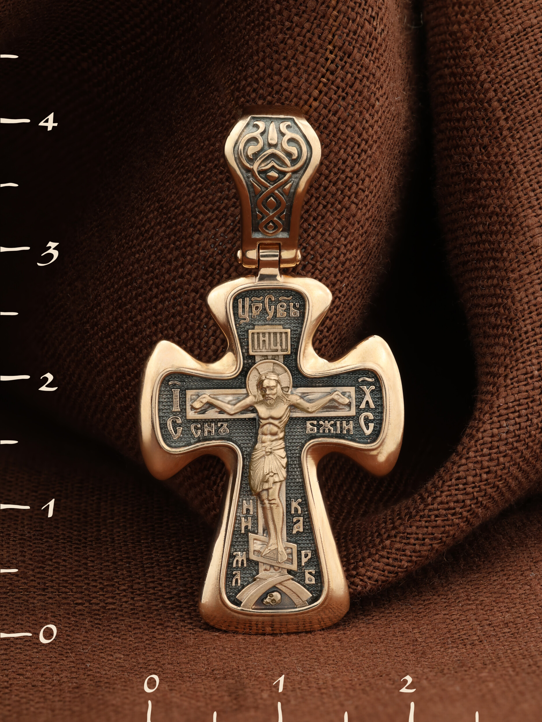 На лицевой стороне креста изображено Распятие Иисуса Христа. Господь представлен свободно покоящимся на кресте с простертыми руками и как бы обнимающим всю Вселенную. Он — Спаситель, искупивший грехи мира, «поправший смертию смерть» и призывающий к Себе «все концы земли». Поэтому рядом с Его образом помещены слова — «НИКА» и «Царь Славы». Эти слова характеризуют Господа как Великого Архиерея, победителя смерти. Также Распятие сопровождается надписями, олицетворяющими Христа. Это святое имя Христа «IC» (Иисус) «ХС» (Христос), и словосочетание «СЫН БОЖИЙ».