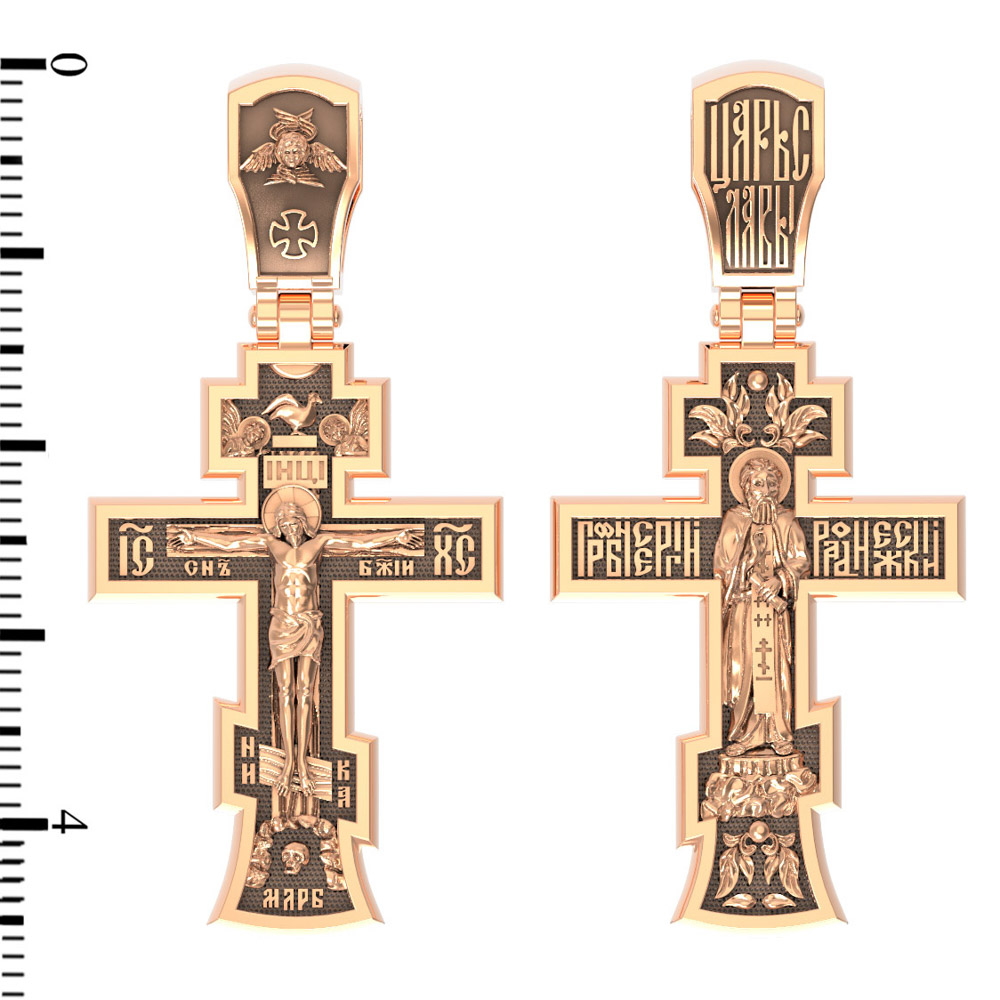 На лицевой стороне этого креста центральную часть занимает икона Распятия Христа — образ жертвы, принесенной Господом за грехи людей. Именно ко Христу, сошедшему на землю ради нашего спасения, возносятся все молитвы. Рядом с Его образом помещены слова — «НИКА» и «Сын Божий». Эти слова характеризуют Господа как Великого Архиерея, победителя смерти. Также Распятие сопровождается надписями, олицетворяющими Христа — это святое имя Христа «IC» (Иисус) «ХС» (Христос). На кулонном кольце написано «Царь Славы».