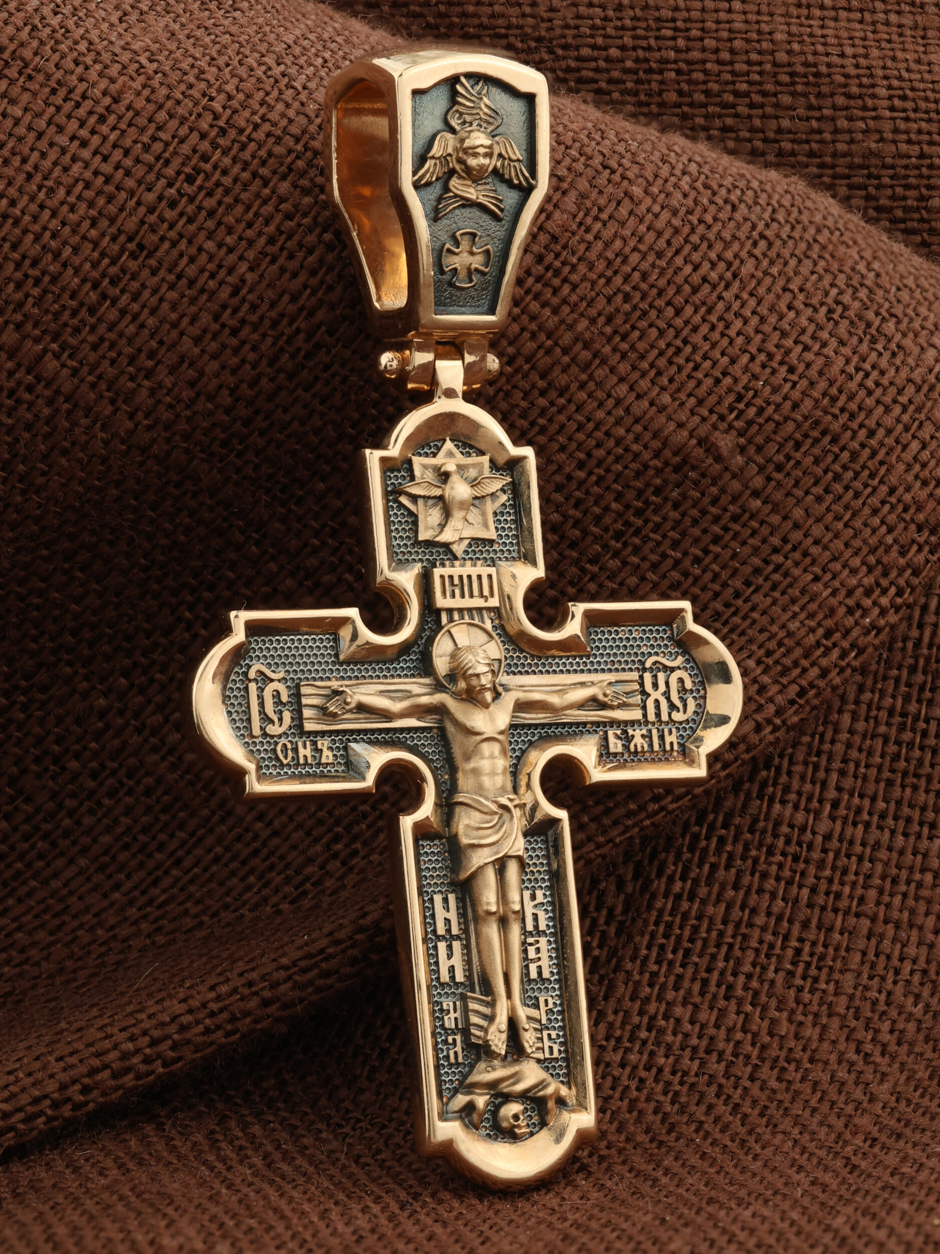На лицевой стороне креста изображено Распятие Иисуса Христа. Господь представлен свободно покоящимся на кресте с простертыми руками и как бы обнимающим всю Вселенную. Верхняя перекладина символизирует титло — табличку, на которой, согласно Евангелию, было начертано: Иисус Назорей Царь Иудейский (IНЦI). Также Распятие сопровождается надписями, олицетворяющими Христа: святое имя Христа «IC» (Иисус) «ХС» (Христос), и словосочетание «СНЪ БЖIЙ» — СЫН БОЖИЙ. Рядом с образом Христа помещены слова — «НИКА» (греч. — Победитель) и четыре буквы «МЛ» «РБ» — Место Лобное Рай Бысть. Возвышение, на котором стоит Крест, символизирует гору Голгофу, на которой произошло Распятие. У подножия Креста изображают прах Адама, обозначенный черепом. На кулонном кольце изображен шестикрылый Серафим — самый приближенный к Господу Ангел.