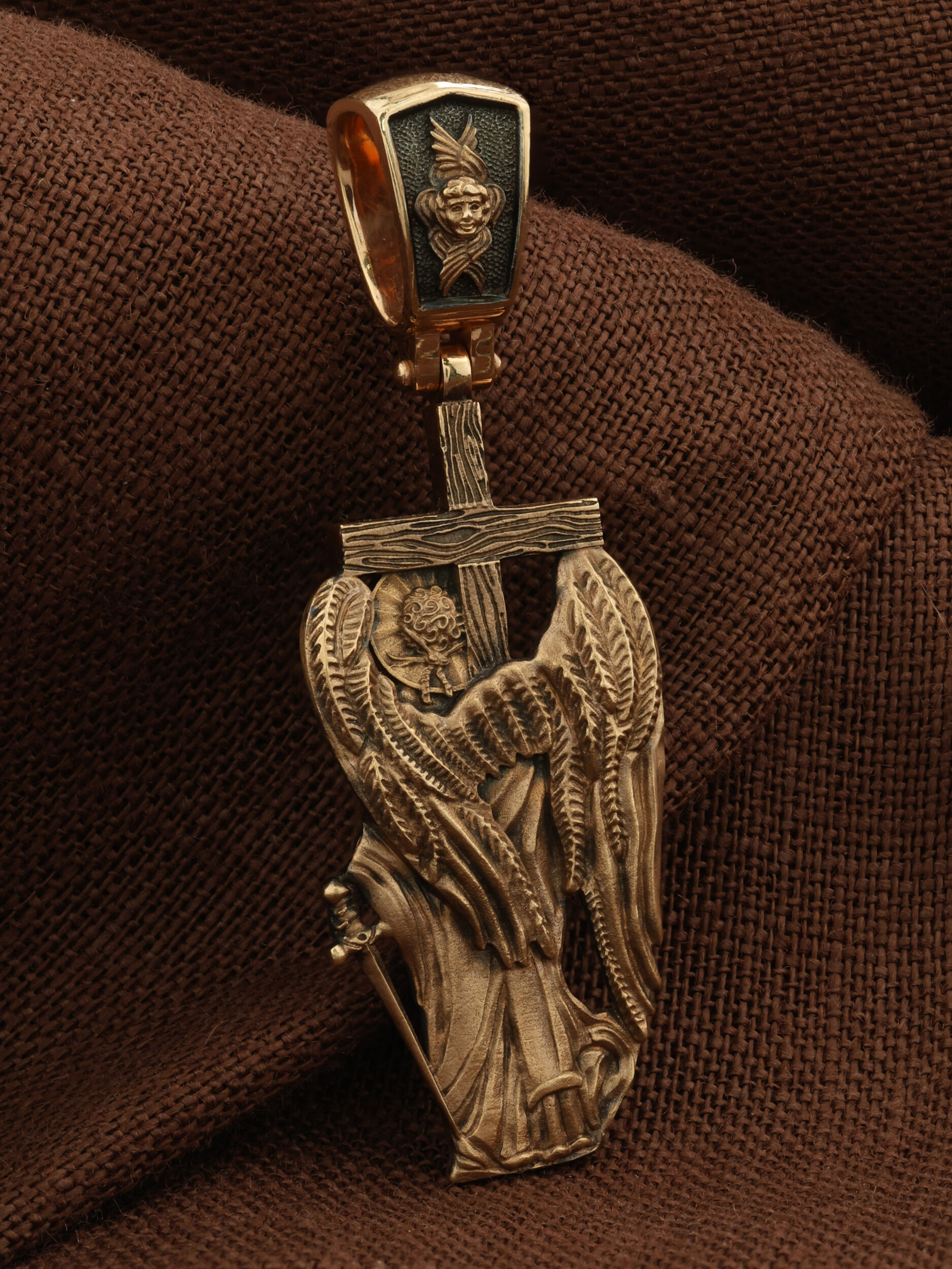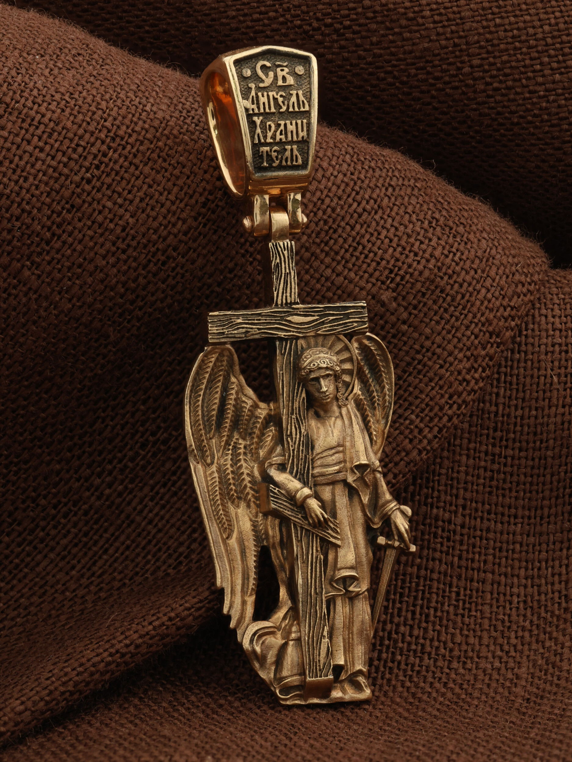 Основой композиции является изображение Святого Ангела-Хранителя держащего в правой руке крест, а в левой — мечь. Крест является символом жертвенной любви всеблагого Бога к падшим людям, всепобеждающим духовным оружием христиан, основанием и средоточием церковной жизни. Господь сказал: «кто хочет идти за Мною, отвергнись себя, и возьми крест свой, и следуй за Мною». (Мк. 8: 34). Ангел-Хранитель — это Ангел приставляемый Богом к человеку при крещении для охраны и помощи в добрых делах. Он невидимо находится при человеке на протяжении всей его жизни, если человек сохраняет в себе любовь к Богу и истинную веру перед Ним. Ангел-Xранитель делают для нас все, что служит к истинному нашему благу и спасению. Невидимо пребывая при нас постоянно, он, руководствуя нас ко спасению, не только по нашему желанию таинственно наставляет нас на все доброе и полезное, не только возносит наши молитвы к Богу, но еще и сам от себя охраняют и защищают нас от врагов видимых и невидимых и ходатайствует за нас пред Богом. Ангел-Хранитель так любит нас, как никто на земле любить не может. Ангел-Хранитель — присный друг наш, незримый тихий собеседник, пресладостный утешитель.