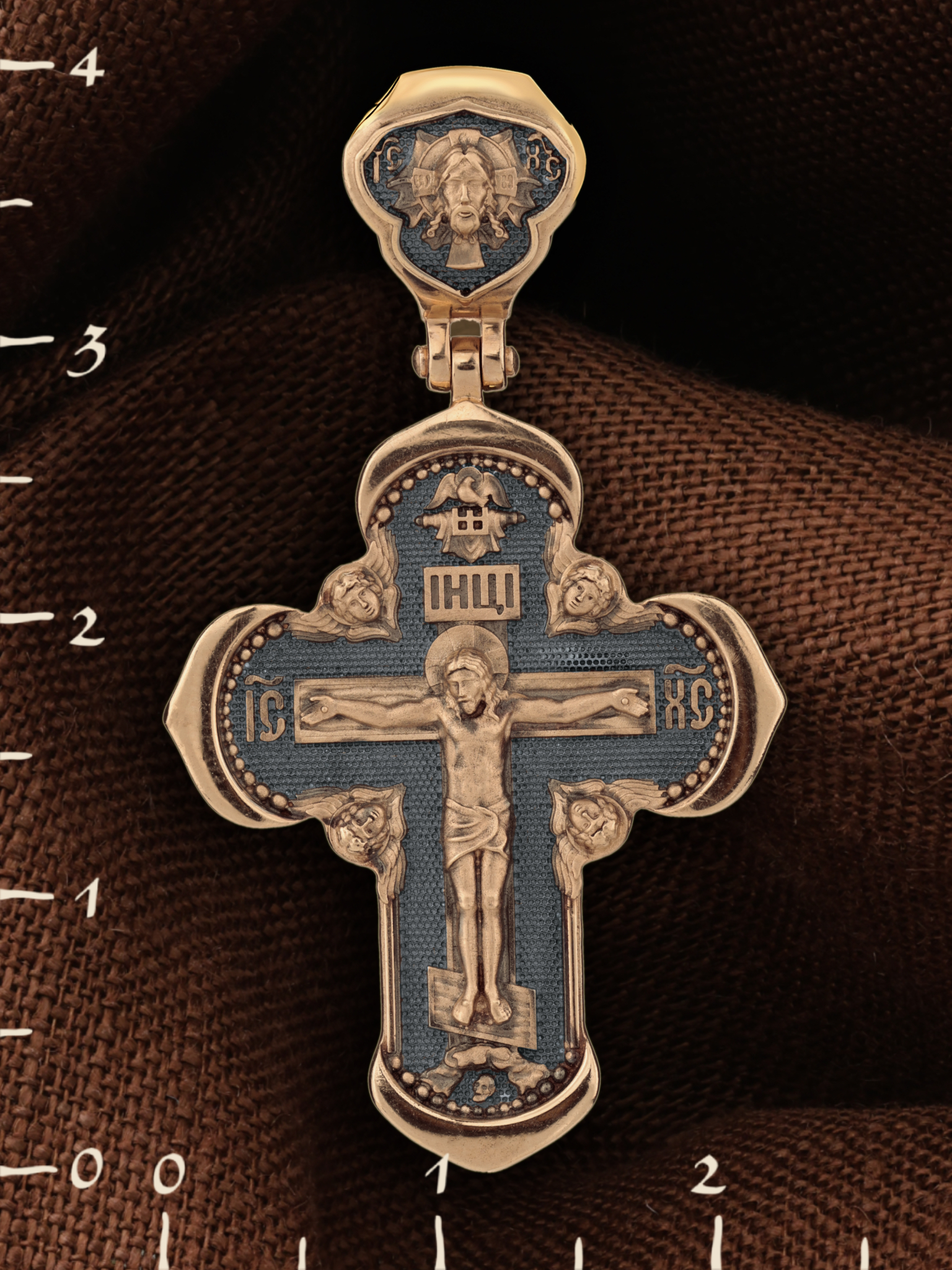 На лицевой стороне креста изображено Распятие Господа и Спасителя нашего Иисуса Христа, отдавшего Себя на смерть, для искупления грехов мира. Крест является символом жертвенной любви Всеблагого Бога к падшим людям, всепобеждающим духовным оружием христиан, основанием и средоточием церковной жизни. Господь сказал: «кто хочет идти за Мною, отвергнись себя, и возьми крест свой, и следуй за Мною». (Мк. 8: 34). На верхней табличке, выше головы Иисуса, расположена надпись, составленная Понтием Пилатом — «IНЦI». Она означает «Иисус Назорей, Царь Иудейский». Надпись «IC» «ХC», означает Иисус Христос, помещается на разных сторонах поперечной перекладины креста. Крест стоит на горе камней, символизирующих Голгофу. В ее основании различается череп– это голова Адама. На кулонном кольце изображен Нерукотворный образ Господа и Спасителя нашего Иисуса Христа, чудесно отпечатавшийся на плате, которым Христос вытер свой лик.