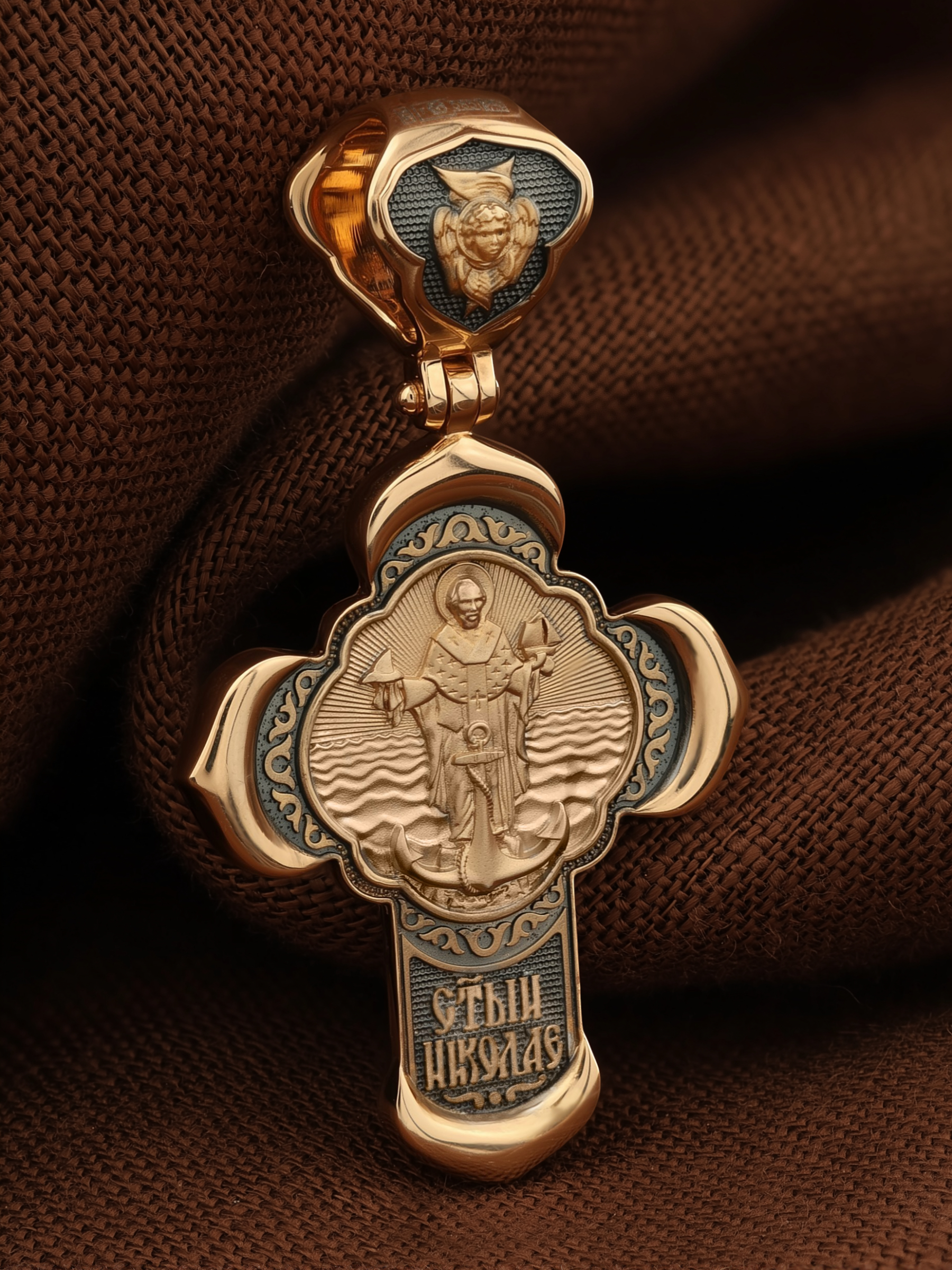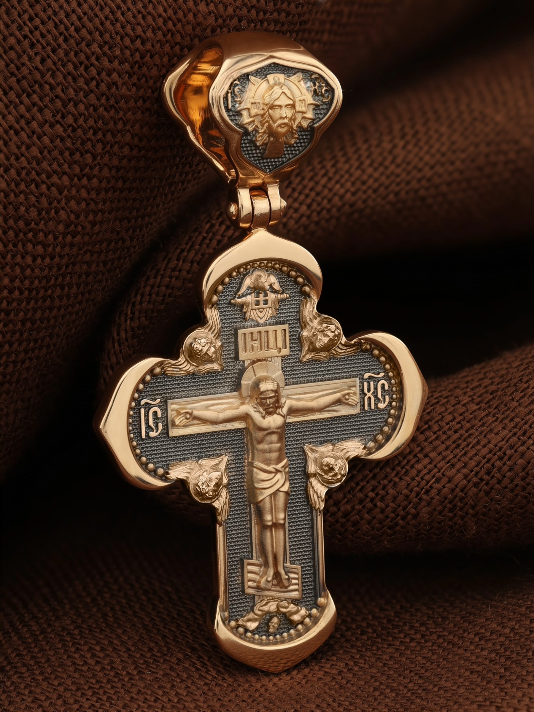 На лицевой стороне креста изображено Распятие Господа и Спасителя нашего Иисуса Христа, отдавшего Себя на смерть, для искупления грехов мира. Крест является символом жертвенной любви Всеблагого Бога к падшим людям, всепобеждающим духовным оружием христиан, основанием и средоточием церковной жизни. Господь сказал: «кто хочет идти за Мною, отвергнись себя, и возьми крест свой, и следуй за Мною». (Мк. 8: 34). На верхней табличке, выше головы Иисуса, расположена надпись, составленная Понтием Пилатом — «IНЦI». Она означает «Иисус Назорей, Царь Иудейский». Надпись «IC» «ХC», означает Иисус Христос, помещается на разных сторонах поперечной перекладины креста. Крест стоит на горе камней, символизирующих Голгофу. В ее основании различается череп– это голова Адама. На кулонном кольце изображен Нерукотворный образ Господа и Спасителя нашего Иисуса Христа, чудесно отпечатавшийся на плате, которым Христос вытер свой лик.