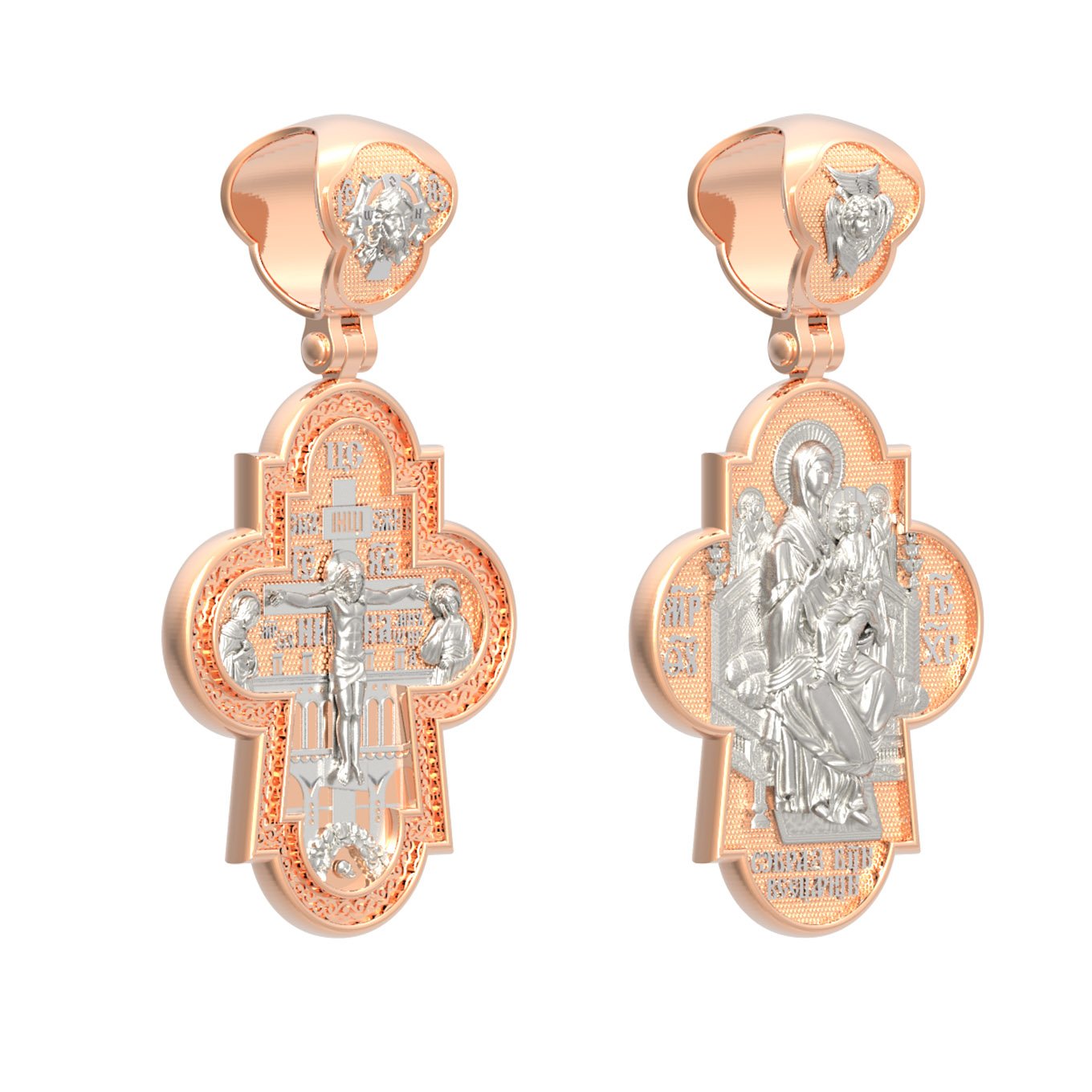 На лицевой стороне креста изображено Распятие Господа и Спасителя нашего Иисуса Христа, отдавшего Себя на смерть, чтобы другие могли жить — жить вечной жизнью, жить с Богом. Через крестную жертву Бог раскрывает нам Свою безмерную любовь и призывает к ответной любви. Своею кровью Господь освятил крест и сделал его проводником Своей благодати, источником освящения верующих. На верхней табличке, выше головы Иисуса, расположена надпись, составленная Понтием Пилатом — «IНЦI». Она означает «Иисус Назорей, Царь Иудейский». Распятие сопровождается каноническими надписями. Над Распятием находится надпись «Царь Славы». Надпись «IС» « ХС» означает Иисус Христос и помещается на разных сторонах поперечной (большой) перекладины креста. Рядом расположены надпись «Сын Божий» и слово «НИКА», что означает «победитель». Слева от Распятия изображена Пресвятая Богородица, справа — апостол и евангелист Иоанн Богослов, один из ближайших учеников Иисуса Христа. За Распятием высится Иерусалимская стена, в знак того, что Господь был распят вне стен города. Возвышение, на котором стоит Крест, символизирует гору Голгофу, на которой произошло Распятие. Под подножием Креста изображена покоящаяся голова (череп) Адама. Над На кулонном кольце изображен Нерукотворный образ Господа и Спасителя нашего Иисуса Христа, чудесно отпечатавшийся на плате, котором Христос вытер свой лик.