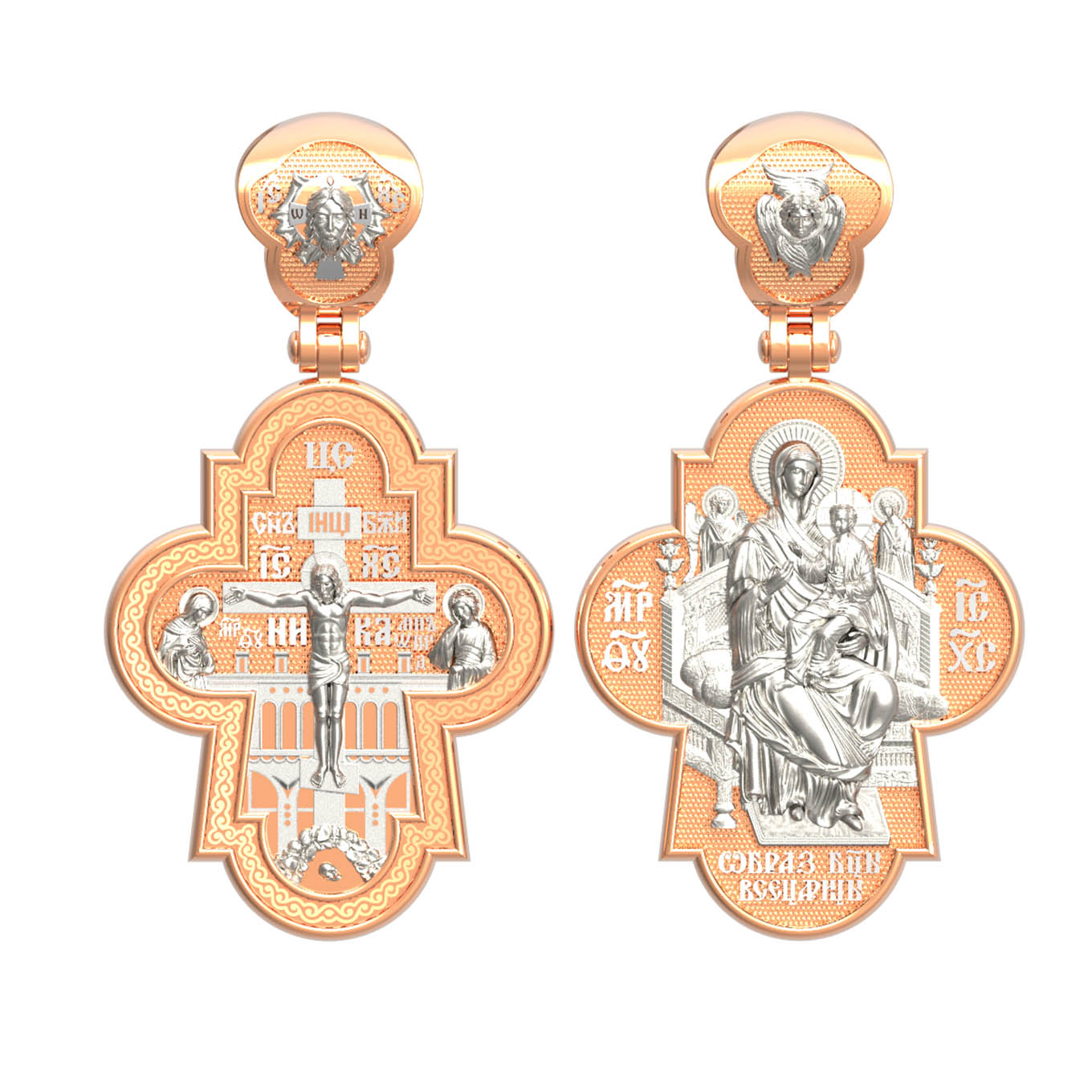На оборотной стороне креста изображена икона Божией Матери «Всецарица» или «Пантанасса», на которой Пресвятая Богородица восседает на царском троне. На руках Ее — Богомладенец Христос со свитком в левой руке и благословляющий десницей. Правой рукой Богородица указывает на Своего Царственного Сына, как на Спасителя мира. Чудотворная икона была написана в XVII веке и находится на Святой Горе Афон, в одном из древних греческих монастырей — Ватопеде. По молитвам перед иконой совершается множество чудесных исцелений. Пречистая Богородица наставляет на праведный путь, помогает укрепить веру, найти утешение. На кулонном кольце изображен шестикрылый Серафим.