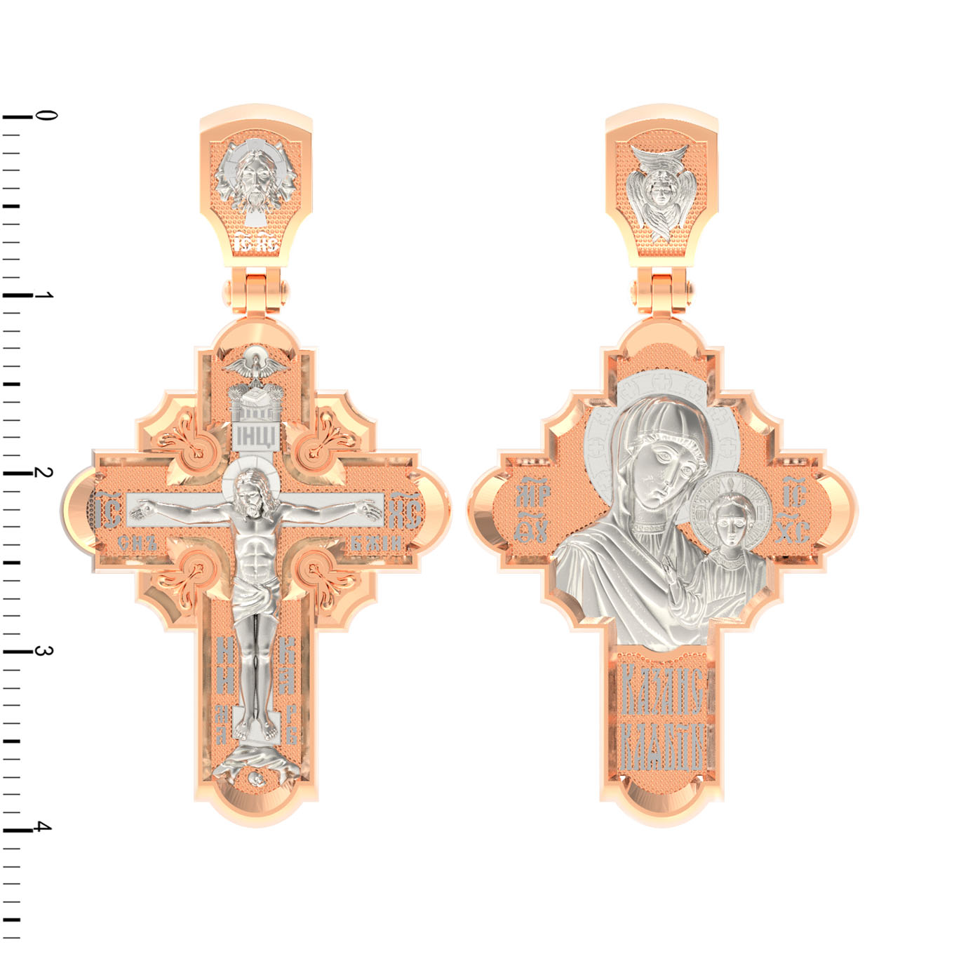 На оборотной стороне креста изображена Казанская икона Божией Матери. Пресвятая Богородица — милосердная заступница, просительница за нас перед Богом. Она стала воистину нашей Матушкой, охраняющей и поддерживающей нас от рождения до самой смерти, а Ее благодатная помощь изливается на нас по молитвам у ее чудотворных икон. Казанская икона явилась в 1579 году в Казани, вскоре после взятия Казанского царства у татар Иоанном Грозным. Этот образ Богородицы не раз сопровождал русский народ в бедствиях. Икона Божией Матери Казанская вдохновляла русских ратников в период Смутного времени при освобождении Москвы от поляков. Перед Казанской иконой в 1709 году, накануне Полтавской победы, император Петр I молился о даровании победы русскому войску. В 1812 году накануне отъезда в действующую армию перед чудотворной иконой Божией Матери молился князь Михаил Кутузов. Не только государственным мужам и дружинам указывала путь икона — по доброй традиции именно этой иконой благословляют на брак молодых родители, длинным списком чудес сопровождается этот образ Богоматери — один из самых любимых на Руси. Существует множество древних списков с этой удивительной иконы.