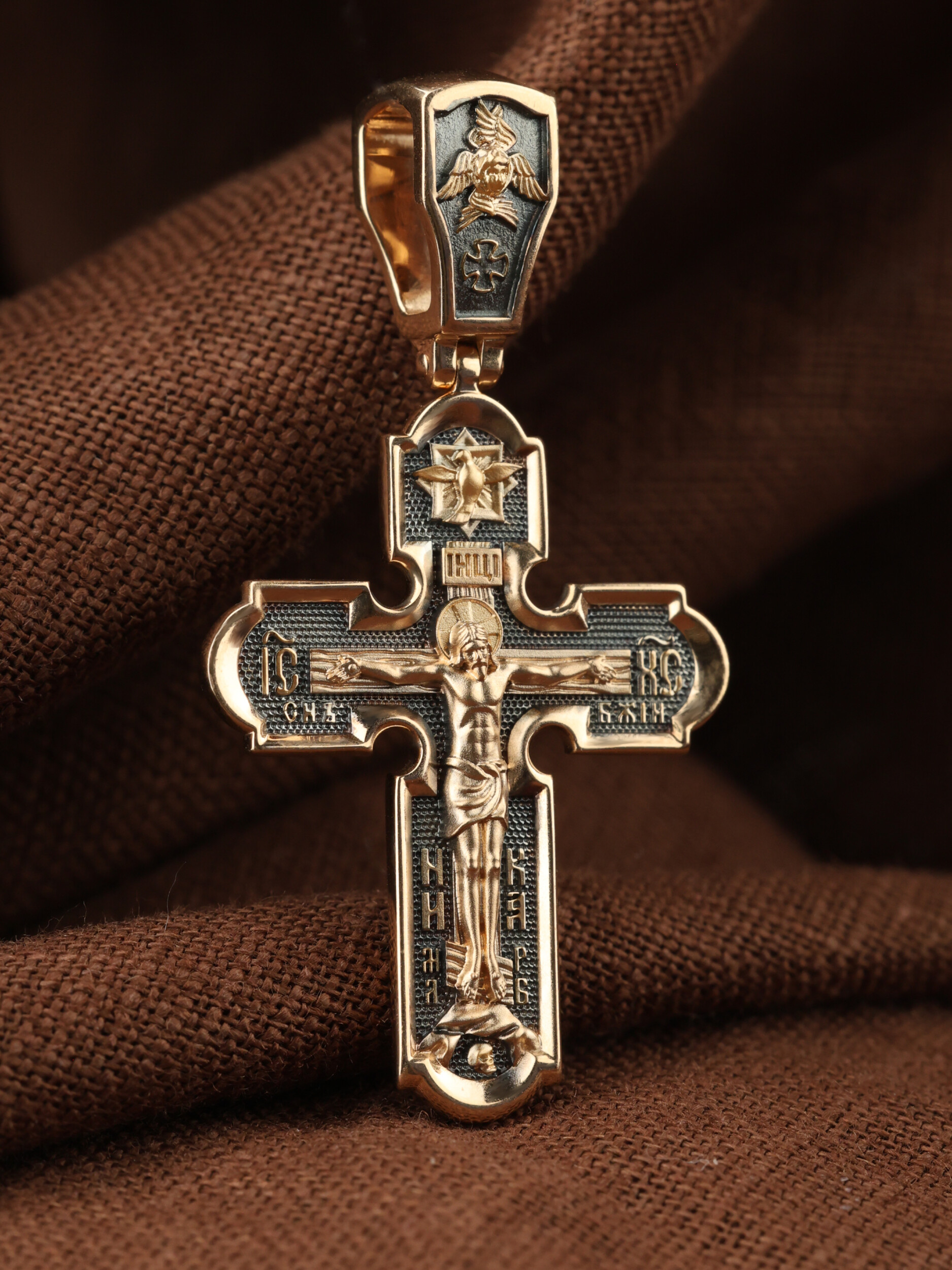 На лицевой стороне креста изображено Распятие Иисуса Христа. Господь представлен свободно покоящимся на кресте с простертыми руками и как бы обнимающим всю Вселенную. Верхняя перекладина символизирует титло — табличку, на которой, согласно Евангелию, было начертано: Иисус Назорей Царь Иудейский (IНЦI). Также Распятие сопровождается надписями, олицетворяющими Христа: святое имя Христа «IC» (Иисус) «ХС» (Христос), и словосочетание «СНЪ БЖIЙ» — СЫН БОЖИЙ. Рядом с образом Христа помещены слова — «НИКА» (греч. — Победитель) и четыре буквы «МЛ» «РБ» — Место Лобное Рай Бысть. Возвышение, на котором стоит Крест, символизирует гору Голгофу, на которой произошло Распятие. У подножия Креста изображают прах Адама, обозначенный черепом. На кулонном кольце изображен шестикрылый Серафим — самый приближенный к Господу Ангел.