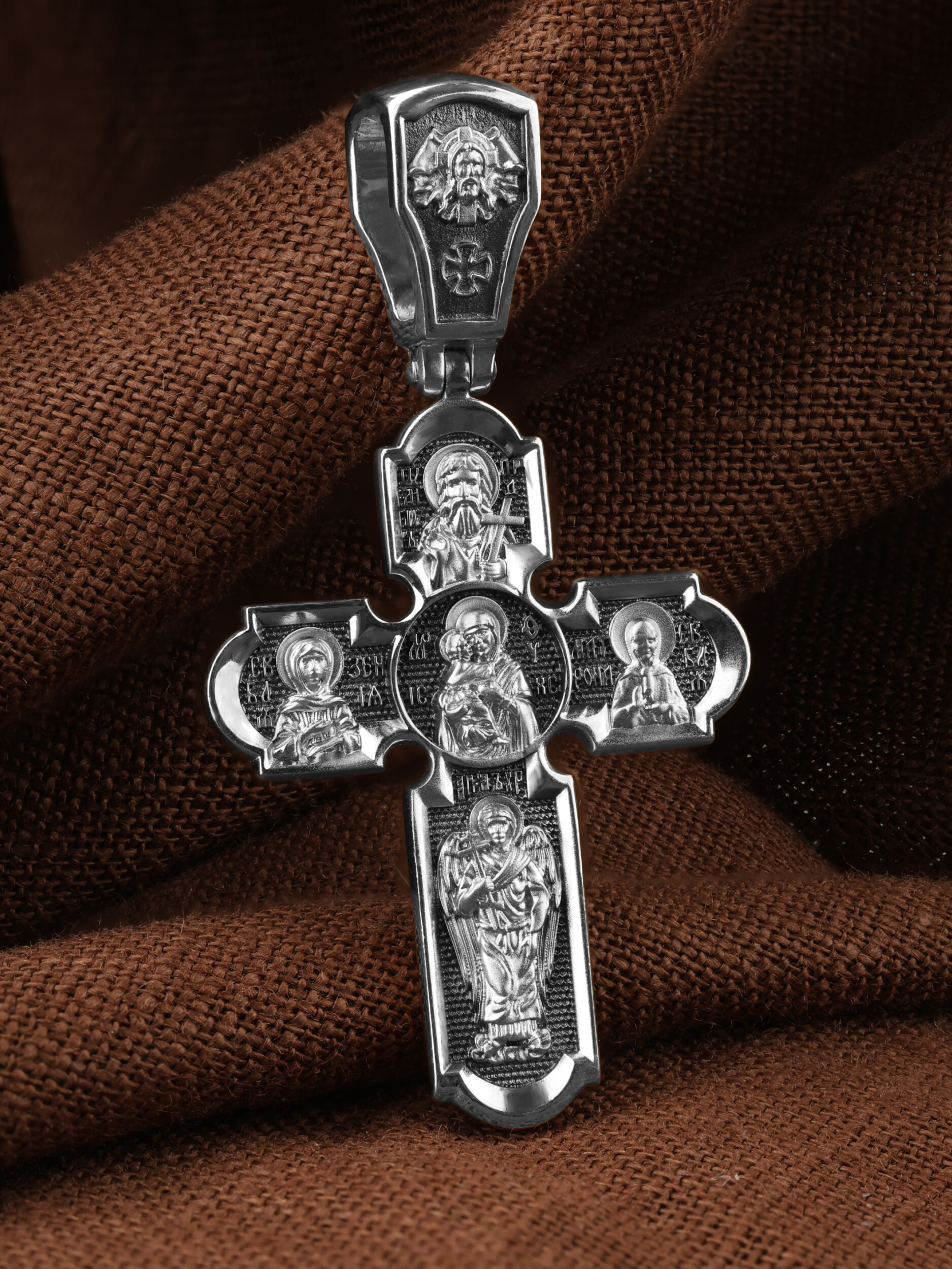 На лицевой стороне креста изображено Распятие Иисуса Христа. Господь представлен свободно покоящимся на кресте с простертыми руками и как бы обнимающим всю Вселенную. Верхняя перекладина символизирует титло — табличку, на которой, согласно Евангелию, было начертано: Иисус Назорей Царь Иудейский (IНЦI). Также Распятие сопровождается надписями, олицетворяющими Христа: святое имя Христа «IC» (Иисус) «ХС» (Христос), и словосочетание «СНЪ БЖIЙ» — СЫН БОЖИЙ. Рядом с образом Христа помещены слова — «НИКА» (греч. — Победитель) и четыре буквы «МЛ» «РБ» — Место Лобное Рай Бысть. Возвышение, на котором стоит Крест, символизирует гору Голгофу, на которой произошло Распятие. У подножия Креста изображают прах Адама, обозначенный черепом. На кулонном кольце изображен шестикрылый Серафим — самый приближенный к Господу Ангел.
