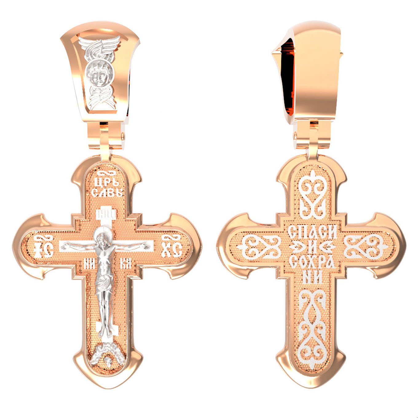 На лицевой стороне креста изображено Распятие Господа нашего Иисуса Христа. В традиции Православия — принято изображать Спасителя как Воскресшего Крестоносителя, призывающего в Свои объятия все концы мира. Его руки имеют горизонтальное положение, открытые ладони пробиты гвоздями, голова наклонена вправо, вокруг головы крестчатый нимб. Крест стоит на горе камней, символизирующих Голгофу, в основании которой различается череп. Это голова Адама. По преданию, тело Адама было погребено Симом, сыном Ноя, на месте, где впоследствии возникла гора Голгофа. Над головой Господа на поперечной перекладине аббревиатура «IНЦI», что символизирует табличку, которая была прибита к Кресту, с надписью «Иисус Назорей Царь Иудейский». Этим иудеи хотели посмеяться над Христом, не зная, что распинают истинного Царя всех царей. По бокам поперечной перекладины титлы святого имени Христа «IC» (Иисус) «ХС» (Христос), и слово «НИКА», что в переводе с греческого означает «победитель». Венчает лицевую сторону креста надпись «Царь Славы».