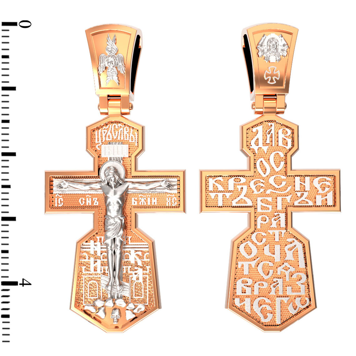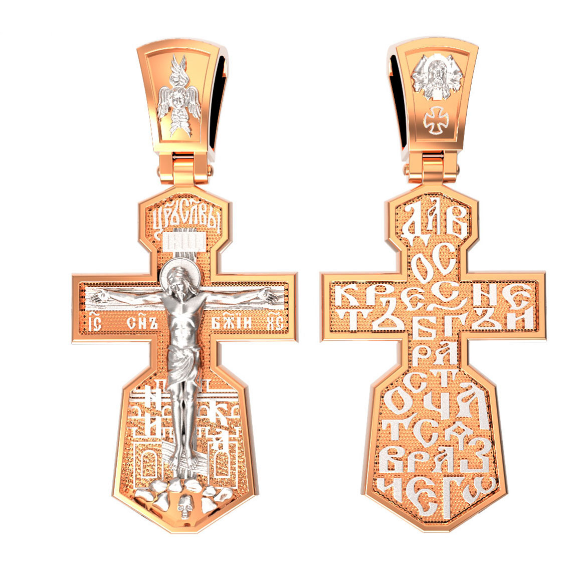 На лицевой стороне креста изображено Распятие Иисуса Христа. Господь представлен свободно покоящимся на кресте с простертыми руками и как бы обнимающим всю Вселенную. Он — Спаситель, искупивший грехи мира, «поправший смертию смерть» и призывающий к Себе «все концы земли». Поэтому рядом с Его образом помещены слова — «НИКА» и «Царь Славы». Эти слова характеризуют Господа как Великого Архиерея, победителя смерти. Верхняя перекладина символизирует титло — табличку, на которой, согласно Евангелию, было начертано: Иисус Назорей Царь Иудейский (IНЦI). Также Распятие сопровождается надписями, олицетворяющими Христа. Это святое имя Христа «IC» (Иисус) «ХС» (Христос), и словосочетание «СЫН БОЖИЙ».