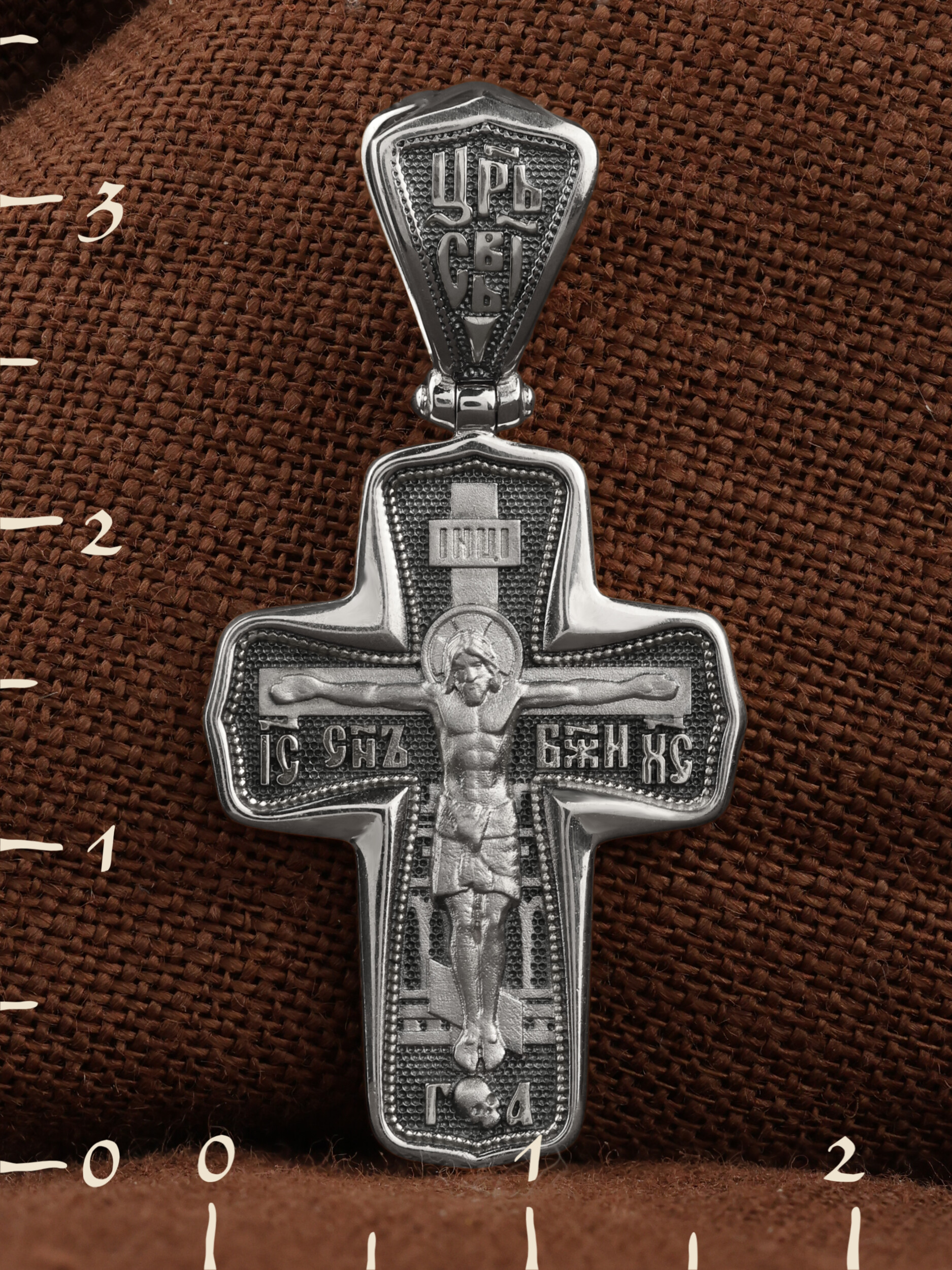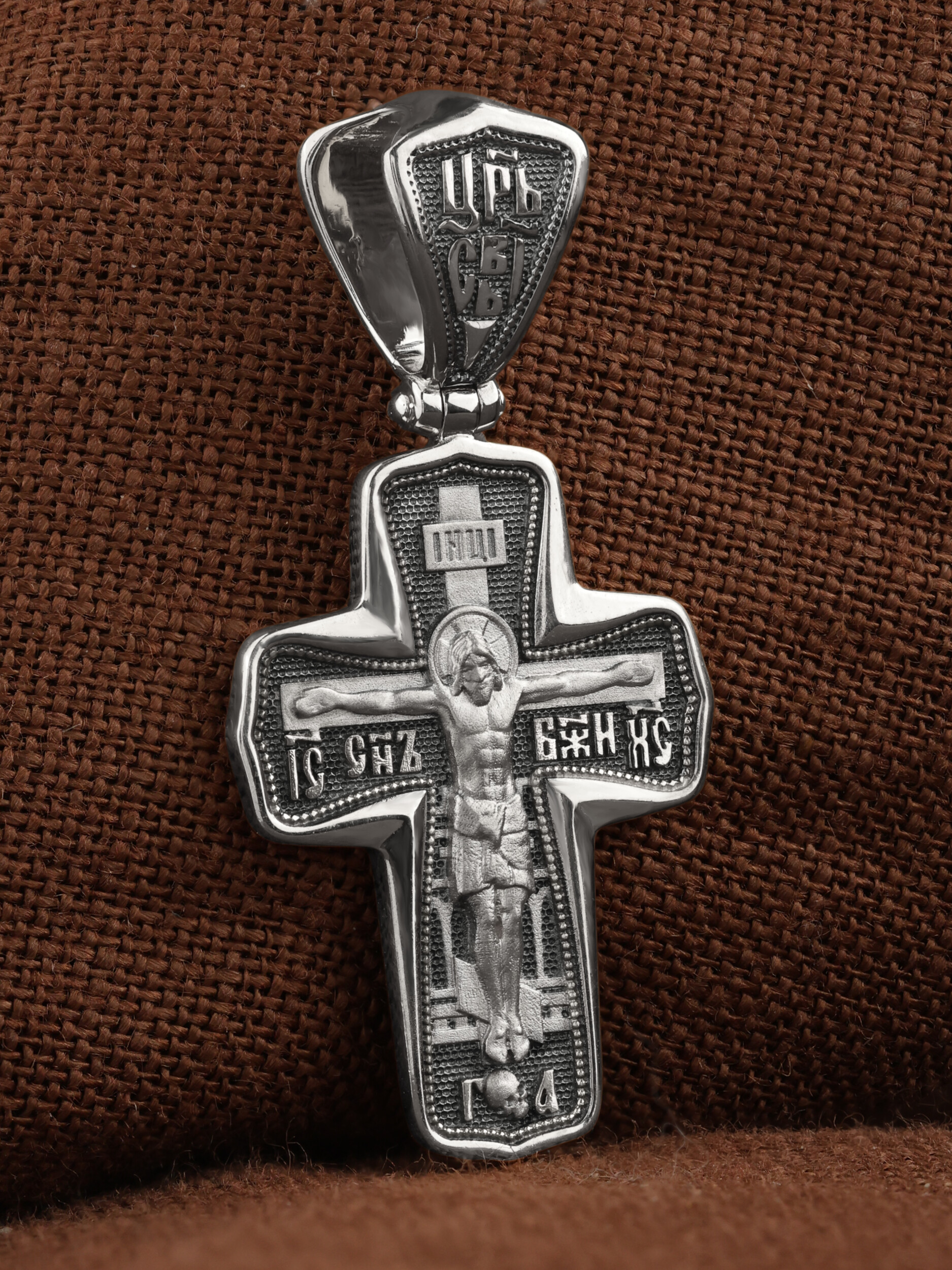 На лицевой стороне креста изображено Распятие Господа и Спасителя нашего Иисуса Христа. Крест- символ спасения и искупления рода человеческого, знамение победы над смертью и адом. Он стал символом восстания из мертвых и обретения вечной жизни в Царствии Иисуса Христа, величайшим символом силы и власти Христовой. Иисус Христос, как искупительная жертва освобождения человечества от власти греха, умер крестной смертью и в третий день воскрес. На верхней табличке, выше головы Иисуса, расположена надпись, составленная Понтием Пилатом — «IНЦI». Она означает «Иисус Назорей, Царь Иудейский». На кулонном кольце помещена надпись «Царь Славы». Надпись «IС» « ХС» означает Иисус Христос и помещается на разных сторонах поперечной перекладины креста. Рядом расположена надпись «Сын Божий». За крестом высится Иерусалимская стена. Ниже подножия креста различается череп и надпись «Г.А» — это глава Адамова. На православном кресте Христос не умирает, а свободно простирает руки, ладони Иисуса открыты, будто он хочет обнять все человечество, даря им свою любовь и открывая путь к вечной жизни.