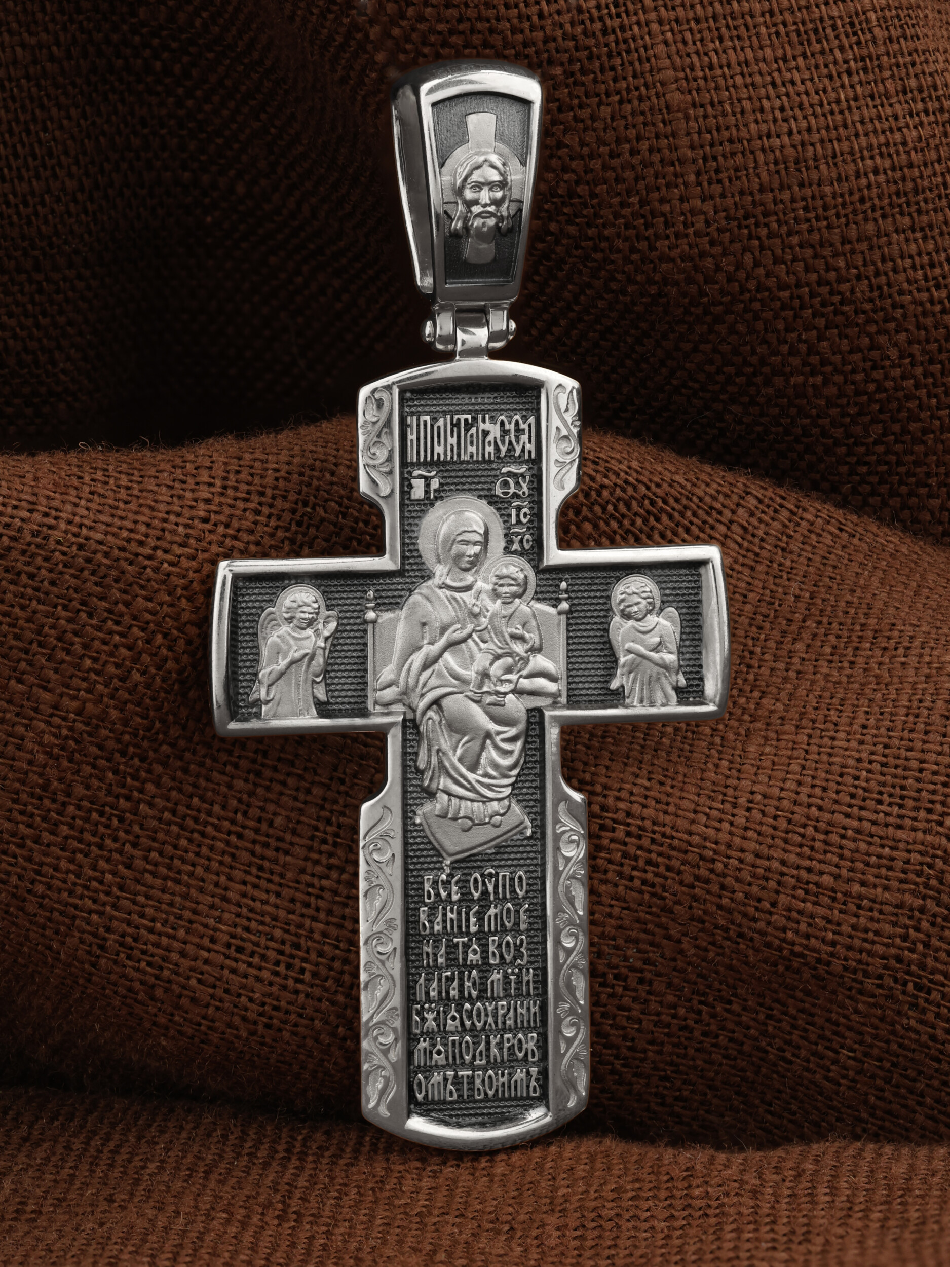 Весь оборот креста занимает икона Божией Матери «Всецарица». Внизу креста написана молитва обращенная к Божией Матери «Все упование мое на Тя возлагаю, Мати Божия, сохрани мя под кровом Твоим».