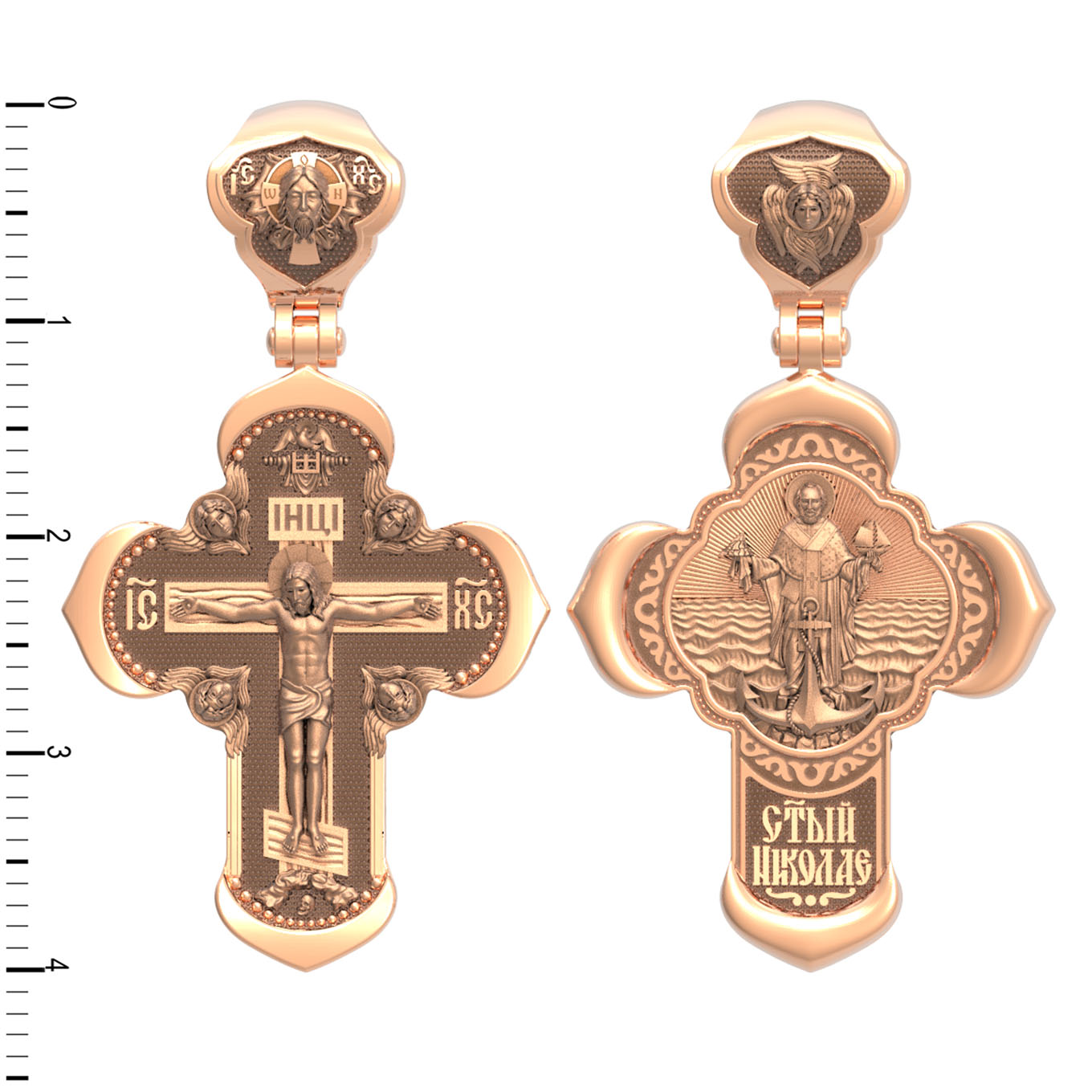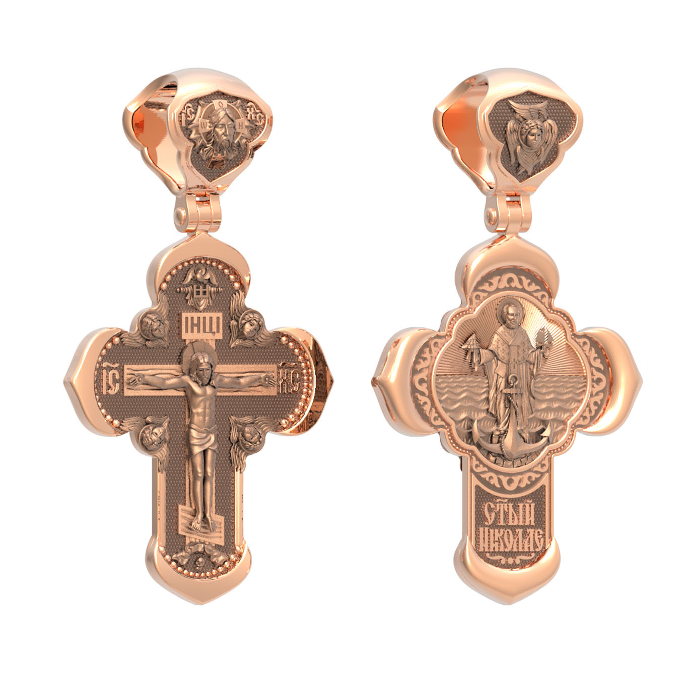На лицевой стороне креста изображено Распятие Господа и Спасителя нашего Иисуса Христа, отдавшего Себя на смерть, для искупления грехов мира. Крест является символом жертвенной любви Всеблагого Бога к падшим людям, всепобеждающим духовным оружием христиан, основанием и средоточием церковной жизни. Господь сказал: «кто хочет идти за Мною, отвергнись себя, и возьми крест свой, и следуй за Мною». (Мк. 8: 34). На верхней табличке, выше головы Иисуса, расположена надпись, составленная Понтием Пилатом — «IНЦI». Она означает «Иисус Назорей, Царь Иудейский». Надпись «IC» «ХC», означает Иисус Христос, помещается на разных сторонах поперечной перекладины креста. Крест стоит на горе камней, символизирующих Голгофу. В ее основании различается череп– это голова Адама. На кулонном кольце изображен Нерукотворный образ Господа и Спасителя нашего Иисуса Христа, чудесно отпечатавшийся на плате, которым Христос вытер свой лик.