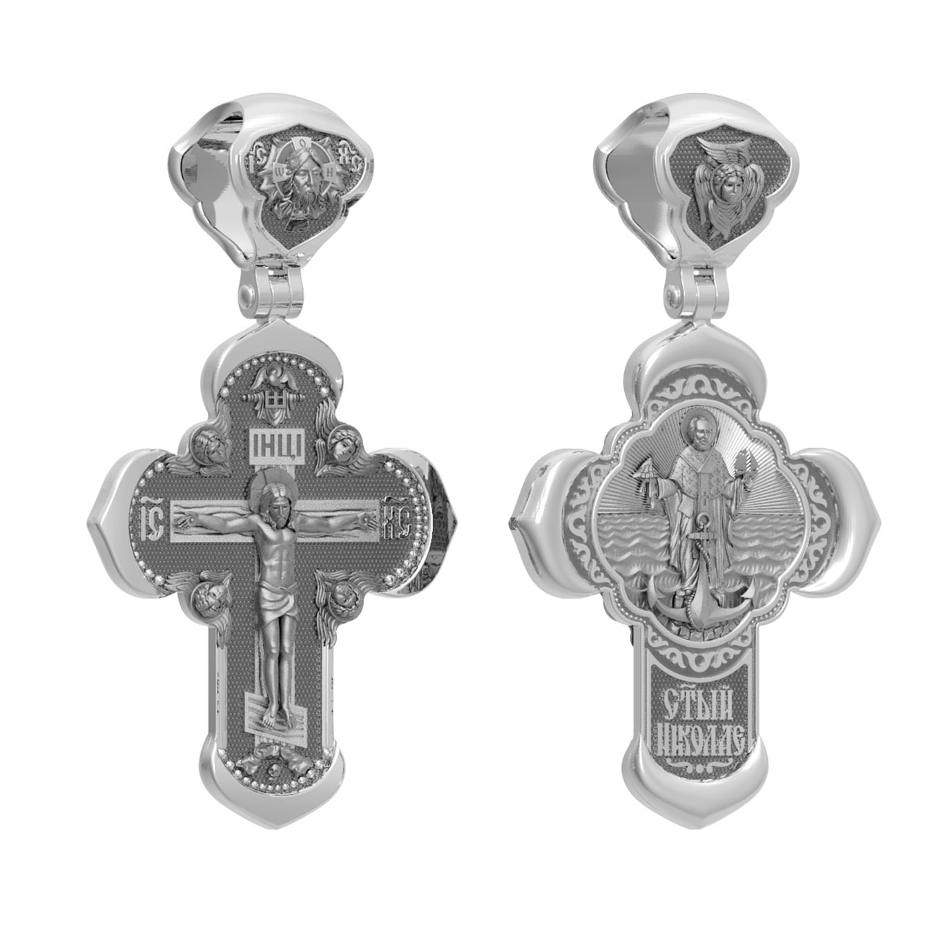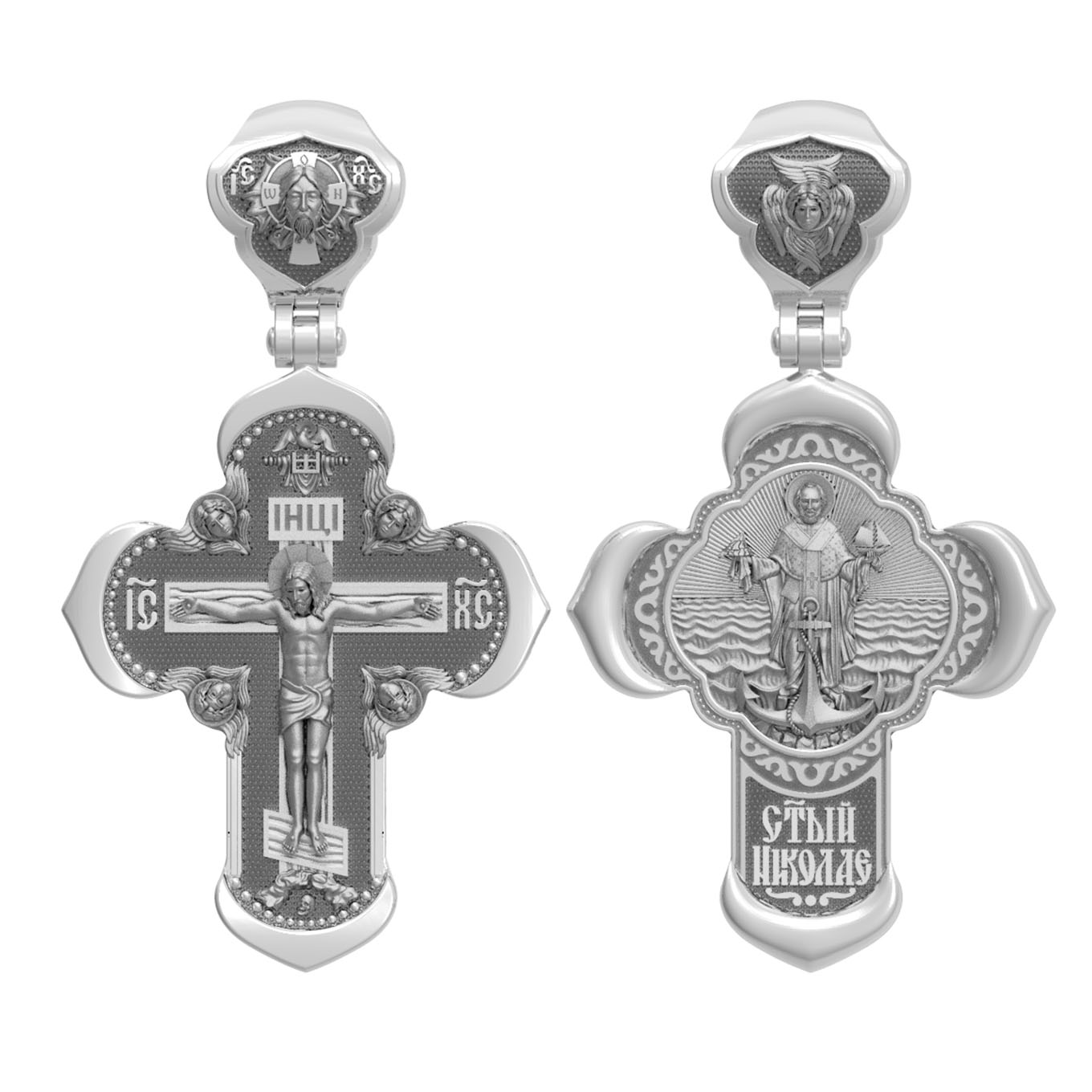 На лицевой стороне креста изображено Распятие Господа и Спасителя нашего Иисуса Христа, отдавшего Себя на смерть, для искупления грехов мира. Крест является символом жертвенной любви Всеблагого Бога к падшим людям, всепобеждающим духовным оружием христиан, основанием и средоточием церковной жизни. Господь сказал: «кто хочет идти за Мною, отвергнись себя, и возьми крест свой, и следуй за Мною». (Мк. 8: 34). На верхней табличке, выше головы Иисуса, расположена надпись, составленная Понтием Пилатом — «IНЦI». Она означает «Иисус Назорей, Царь Иудейский». Надпись «IC» «ХC», означает Иисус Христос, помещается на разных сторонах поперечной перекладины креста. Крест стоит на горе камней, символизирующих Голгофу. В ее основании различается череп– это голова Адама. На кулонном кольце изображен Нерукотворный образ Господа и Спасителя нашего Иисуса Христа, чудесно отпечатавшийся на плате, которым Христос вытер свой лик.