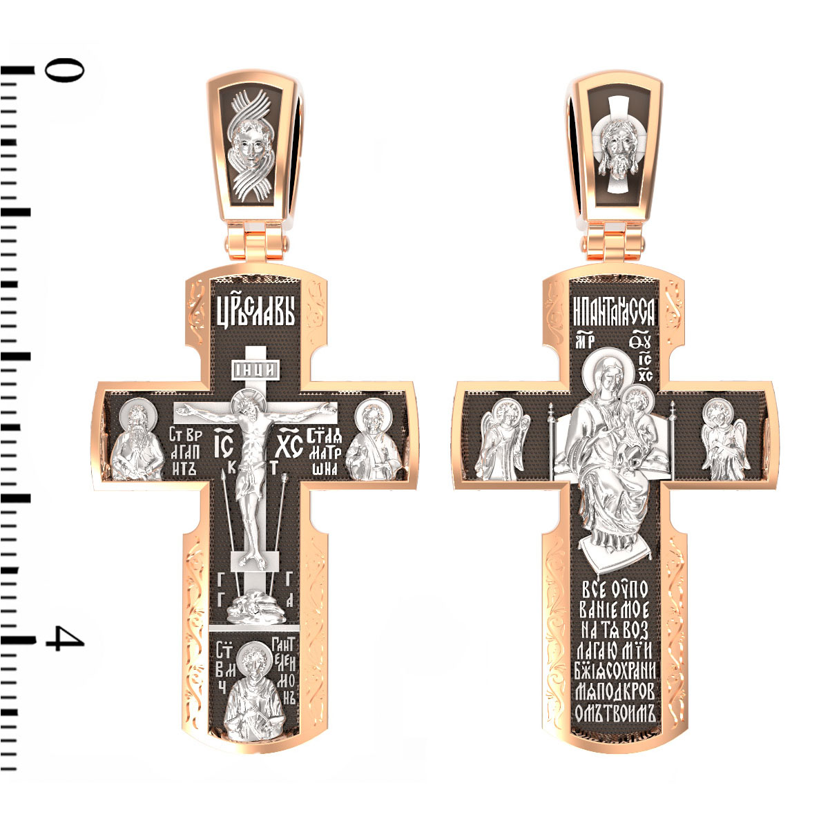 Как действенная помощь в немощах и болезнях был создан крест с образами святых целителей и со знаменитой афонской иконой Божией Матери «Всецарица». Над титлом видим слова «ЦРЬ СЛВЫ» — Царь Славы. Верхняя перекладина символизирует собой табличку с надписью «IHЦI» — Иисус Назарянин Царь Иудейский. Под перекладиной пишется сокращенно имя Спасителя «IC XC» — Иисус Христос. Возвышение, на котором стоит Крест, символизирует гору Голгофу, на которой произошло Распятие. У подножия Креста изображают прах Адама, обозначенный черепом. Справа от Распятия помещен образ прославленной святой блаженной Матроны. Слева — икона преподобный Агапита. Этот святой жил в пещерах Киево-Печерского монастыря в XI веке и бескорыстно врачевал мирян и монахов. У основания Креста Господня изображен великомученик Пантелеимон Целитель. Господь даровал удивительную силу его молитве. Ею он исцелял любые болезни и даже воскрешал умерших.