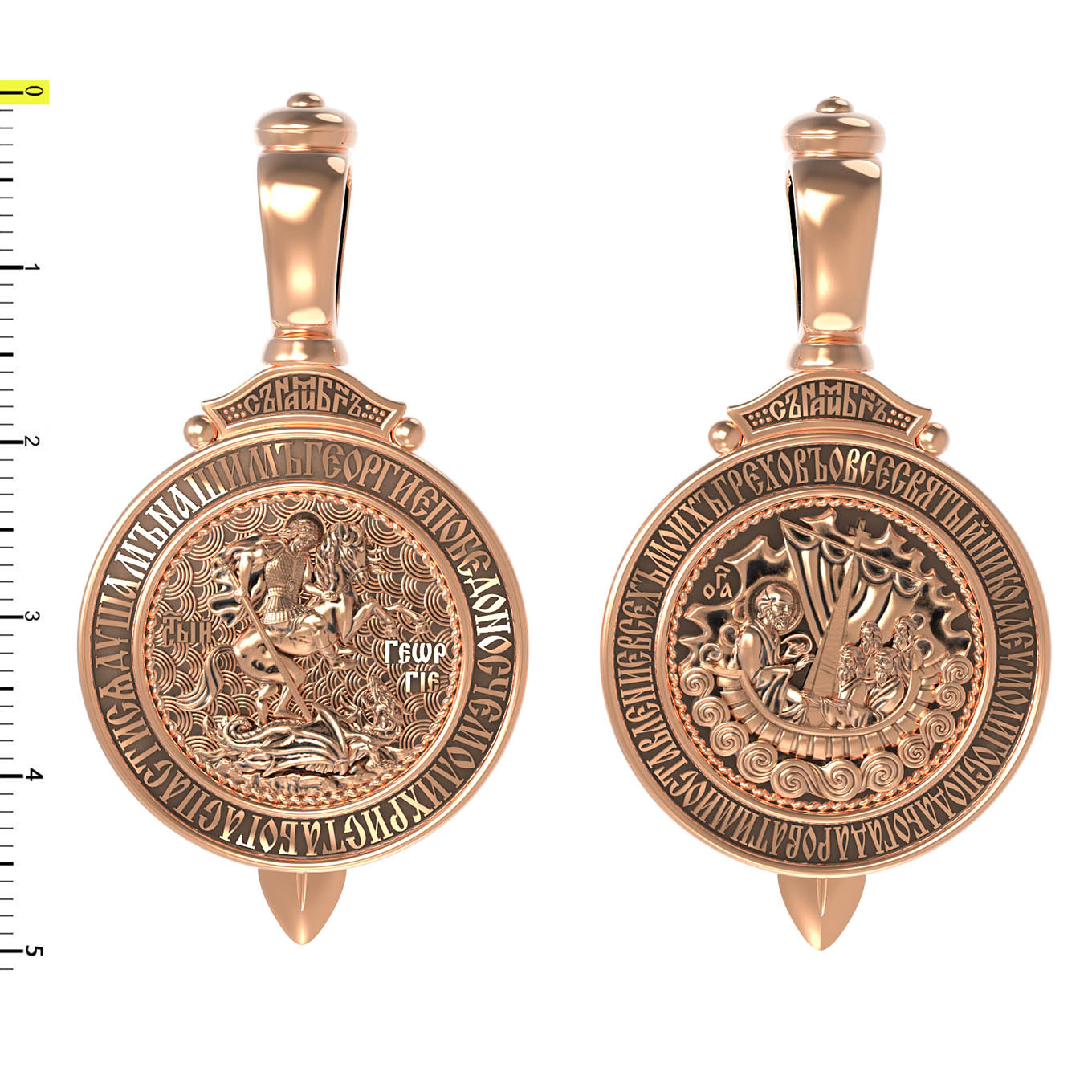 Основой композиции лицевой стороны является изображение Святого Великомученика Георгия Победоносца — одного из самых почитаемых и удивительных святых. На Руси он известен как Юрий или Егорий, покровитель воинов, помощник в крестьянском труде. На образке он изображен как воитель, сидящий на вздыбленном коне и поражающий копьем огнедышащего змея. Змей символизирует собою сатанинские силы. Молитвами вознесенными к Всевышнему и своей непреклонной верой он смог одолеть чудовище. Святой убил змея, спас царскую дочь, принесенную в жертву, и жителей города, их души от влияния дьявола, породив в них надежду и веру в Господа, призывая людей принять христианскую веру. Изображение святого великомученика Георгия Победоносца обрамлено словами молитвы: «Геогрие Победоносче, моли Христа Бога спастися душам нашим».