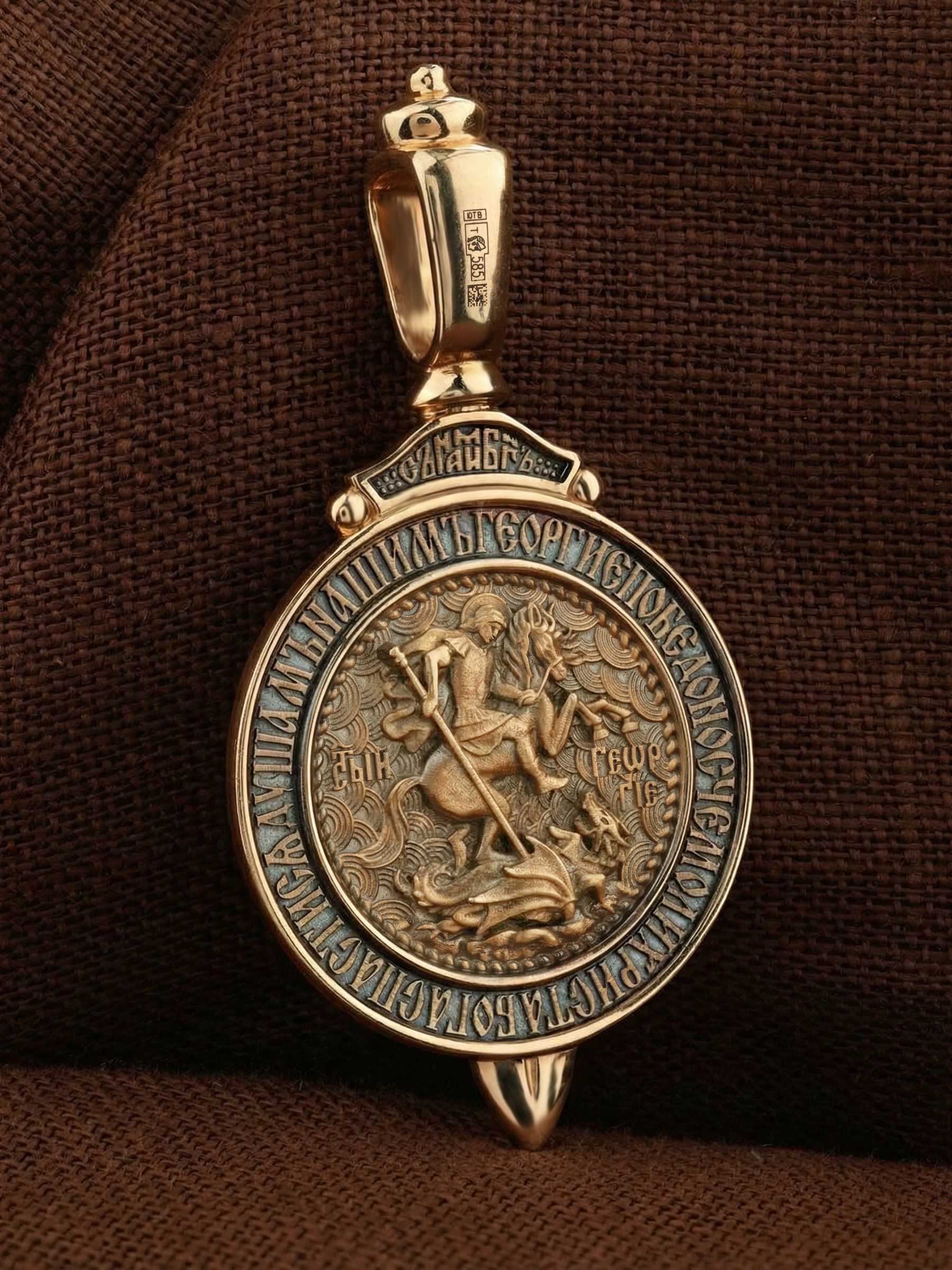 Основой композиции лицевой стороны является изображение Святого Георгия Победоносца. Святой Георгий один из наиболее почитаемых святых в Христианской Церкви. На Руси он известен как Юрий или Егорий, покровитель воинов, помощник в крестьянском труде. На образке изображено самое знаменитое чудо святого: спасение принцессы от змея, которому она предназначалась в жертву. Чудо это имеет символическое толкование. Принцесса означает душу человеческую, а змей — дьявола, желающего ее поглотить. Святой Георгий, небесный защитник, спускается с Небес, чтобы помочь душе избавиться от гибели. По контуру образка написана молитва: «Геогрие Победоносче, моли Христа Бога спастися душам нашим».