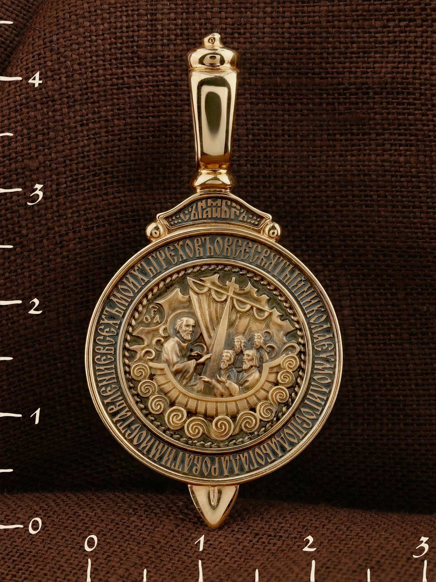 На обороте изображена икона «Чудо спасения трех корабельщиков». Икона рассказывает о том, как погибающие в море купцы обратились за помощью к свт. Николаю и были чудесно им спасены. Сначала они были, как пророк Иона, проглочены рыбой, потом «исплюнуты» ею на поднявшийся из морских пучин камень, а затем на камне, как на корабле, доставлены к городу. Правитель города, узнав о злодействе грабителей-корабельщиков, наказал их и вернул купцам товары. Вокруг — слова молитвы: «О Всесвятый Николае, умоли Господа Бога даровати ми оставление всех моих грехов».