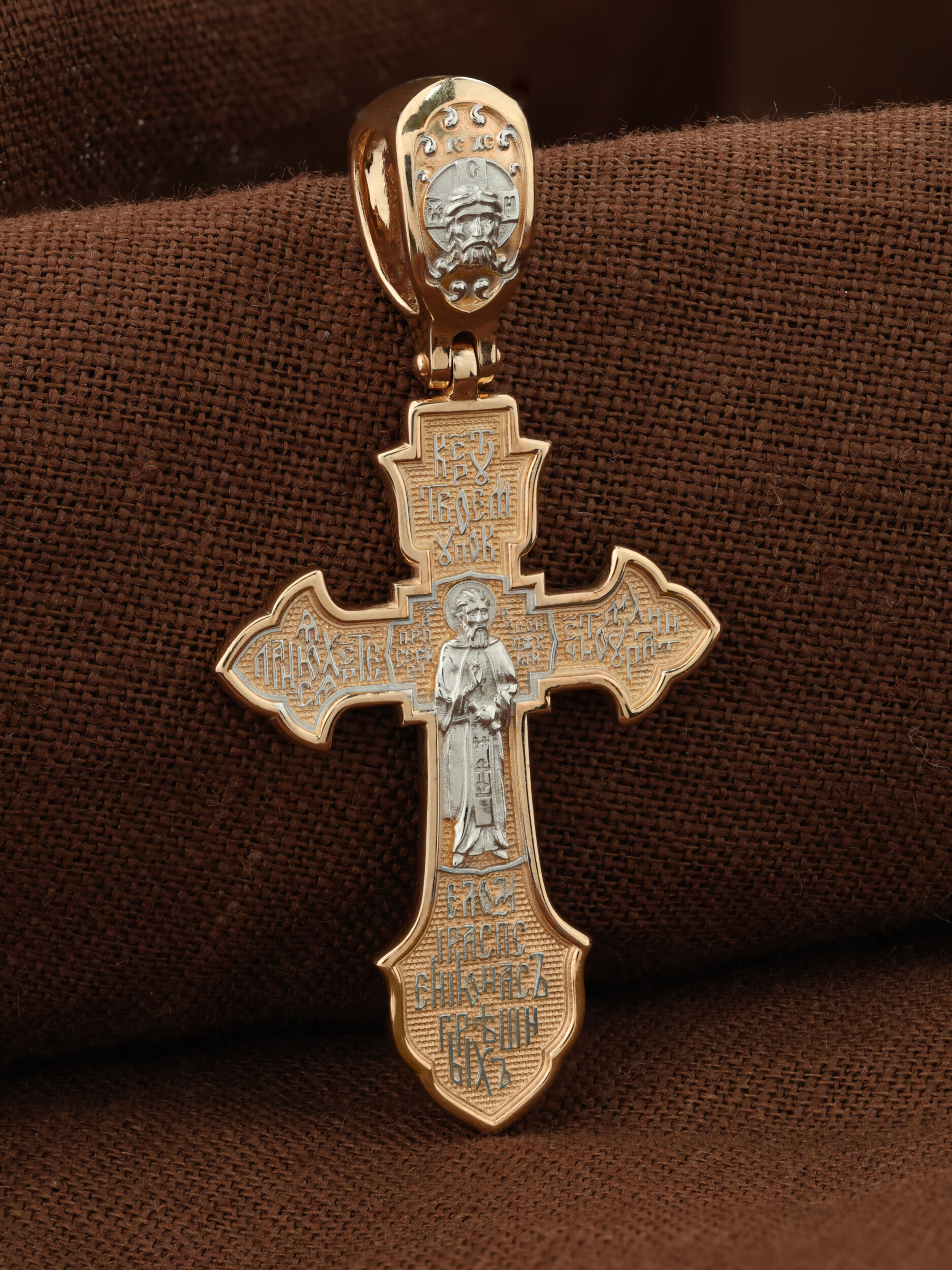 На лицевой стороне этого креста центральную часть занимает икона Распятия Христа — образ жертвы, принесенной Господом за грехи людей. Именно ко Христу, сошедшему на землю ради нашего спасения, возносятся все молитвы. Рядом с Его образом помещены слова — «НИКА» и «Царь Славы». Эти слова характеризуют Господа как Великого Архиерея, победителя смерти. Также Распятие сопровождается надписями, олицетворяющими Христа — это святое имя Христа «IC» (Иисус) «ХС» (Христос). Венчает лицевую сторону креста надпись «Царь Славы». На кулонном кольце помещено изображение Спаса Нерукотворного.