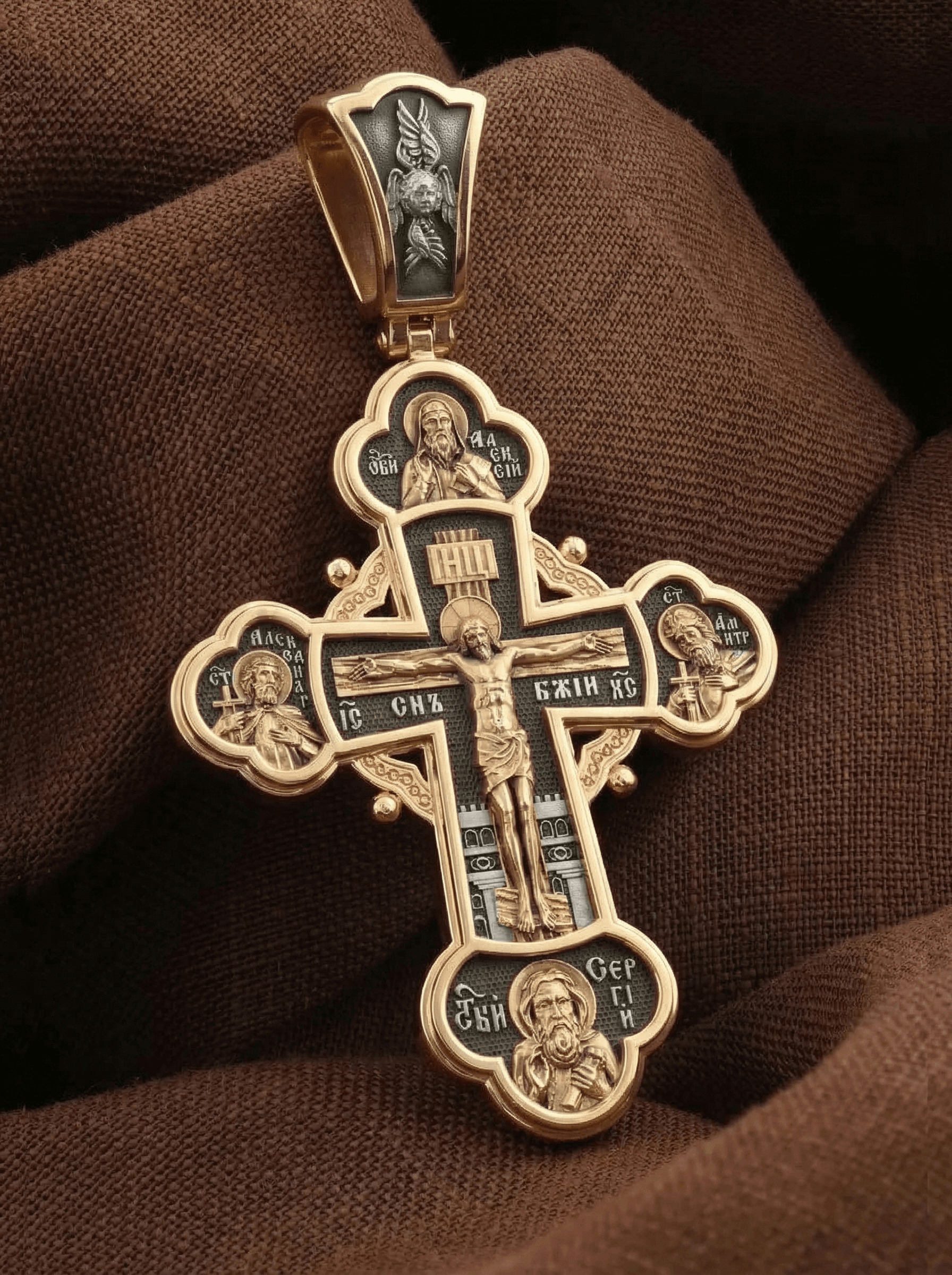 На лицевой стороне креста в центре изображено Распятие Господа Иисуса Христа. Слева от Господа находится святой благоверный князь Александр Невский, справа — святой благоверный князь Димитрий Донской. Святые князья почитаются как покровители воинов и защитники от врагов телесных и душевных. Вверху и над Распятием — образ митрополита московского святителя Алексия. Он почитается как помощник в воспитании детей и целитель, особенно при болезни глаз. Внизу — икона преподобного Сергия Радонежского, великого чудотворца и целителя. К нему обращаются в различных болезнях, тяжелых жизненных ситуациях, а также когда у детей возникают сложности в обучении.