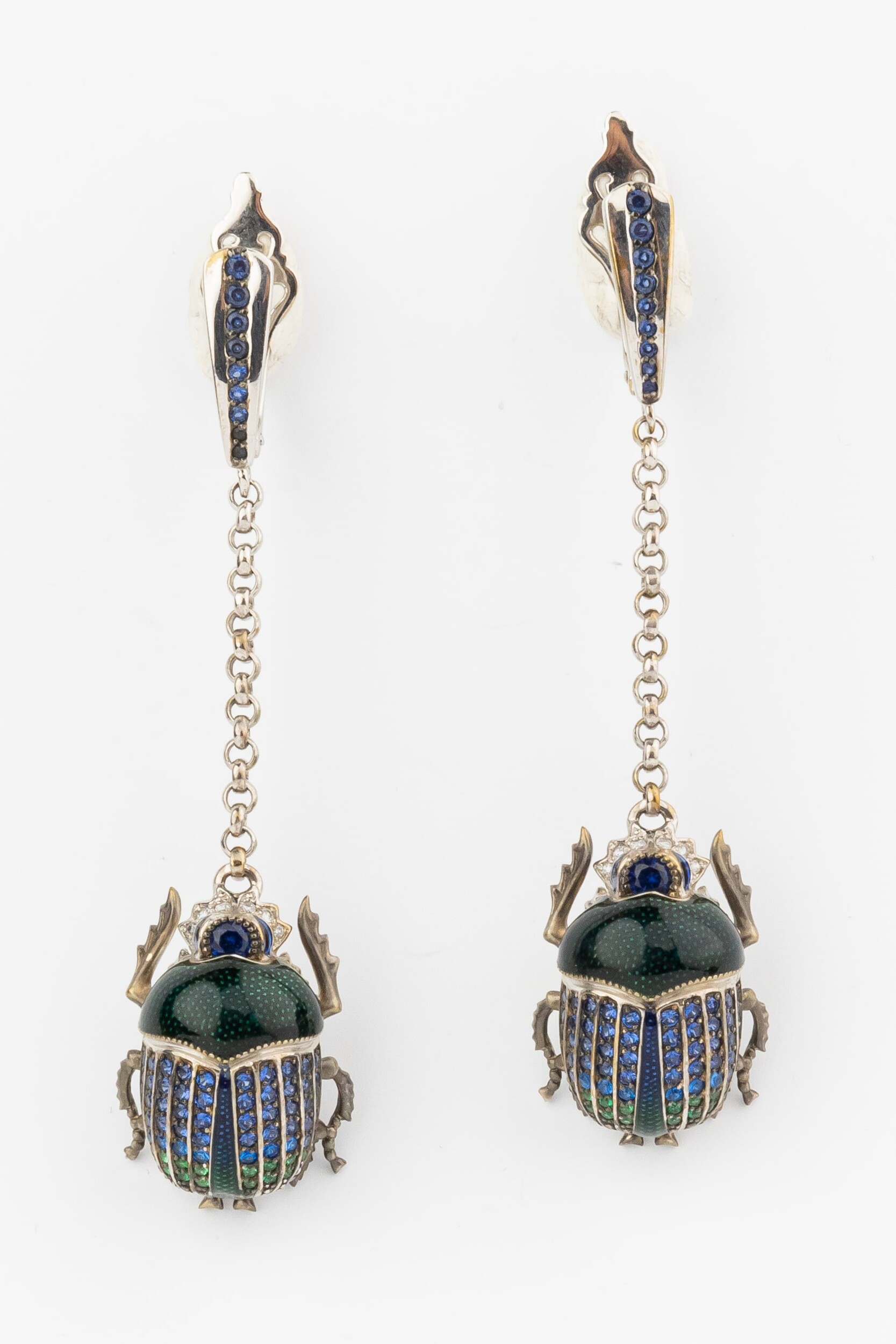 Серьги из белого золота c эмаль , фианитом и сапфиром