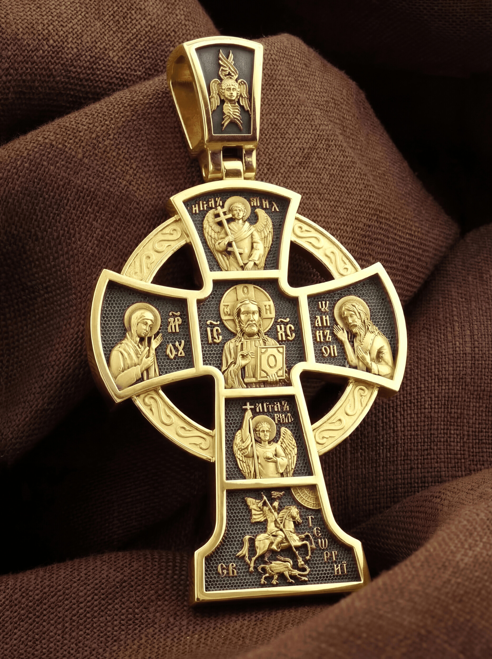 Вверху и внизу от спасителя предстоят два архангела, Михаил (Первый служитель Божественной славы, страж и защитник) и Гавриил (служитель Божественной крепости и изъявитель сокровенных Божьих тайн). Внизу помещен образ свт. Георгия Победоносца. Святой при жизни прославился не только как храбрый воин и твердый исповедник веры, но и как сострадательный, милосердный целитель и чудотворец. Святому молятся о покровительстве воинам и армии, о защите государства, сохранении и спасения России.