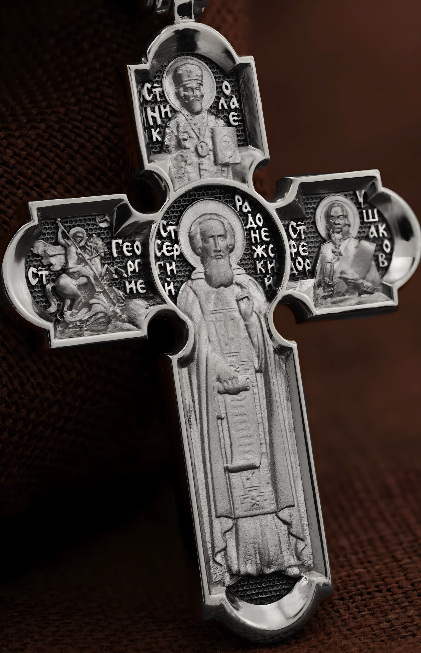 На центральной части оборотной стороны креста размещен образ Святого Преподобного Сергия, игумена Радонежского, Чудотворца. Он является духовным собирателем русского народа и русской культуры, основателем целого ряда монастырей, в том числе Троице-Сергиевой лавры под Москвой. Выше образа изображен Святитель Николай Чудотворец, архиепископ Мир Ликийских. Он является одним из самых почитаемых святых в православном мире, издревле считающийся помощником и молитвенником за всех, притекающих к нему. Слева — образ Святого Великомученика Георгия Победоносца. Он изображен как воитель, сидящий на вздыбленном коне и поражающий копьем огнедышащего змея. Змей символизирует собою сатанинские силы. Справа — образ Святого Праведного воина Феодора Ушакова. Он является выдающийся русским флотоводцем. Федор Ушаков сочетал свой высокий воинский чин с глубоким смирением, неподдельной скромностью и искренней верой. На кулонном кольце изображен образ Архангела Михаила.