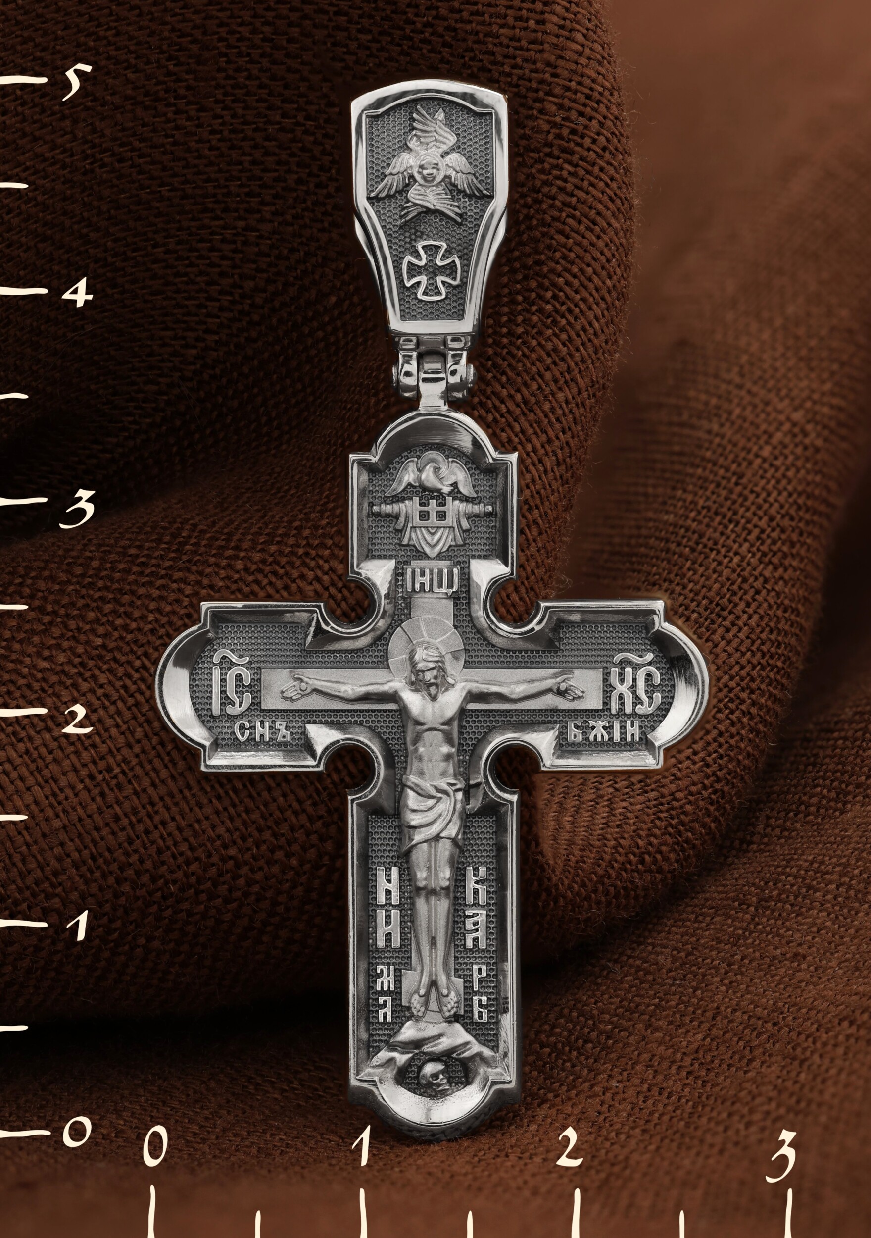 На лицевой стороне креста изображено Распятие Господа и Спасителя нашего Иисуса Христа. Крест- символ спасения и искупления рода человеческого, знамение победы над смертью и адом. Иисус Христос, как искупительная жертва освобождения человечества от власти греха, умер крестной смертью и в третий день воскрес. Верхняя перекладина символизирует титло — табличку, на которой, согласно Евангелию, было начертано: Иисус Назорей Царь Иудейский (IНЦI). Надпись «IC» «ХC», означает Иисус Христос, помещается на разных сторонах поперечной перекладины креста. Ниже перекладины расположено словосочетание «СЫН БОЖИЙ», что означает божественную природу Иисуса Христа. Надпись «МЛРБ» — «место лобное рай бысть» означает, что место лобное стало раем и помещаются в нижней части креста. Рядом — слово «НИКА», что означает «победитель». Возвышение, на котором стоит Крест, символизирует гору Голгофу, на которой произошло Распятие. Под подножием Креста изображена покоящаяся голова (череп) Адама. На кулонном кольце изображен шестикрылый Серафим.