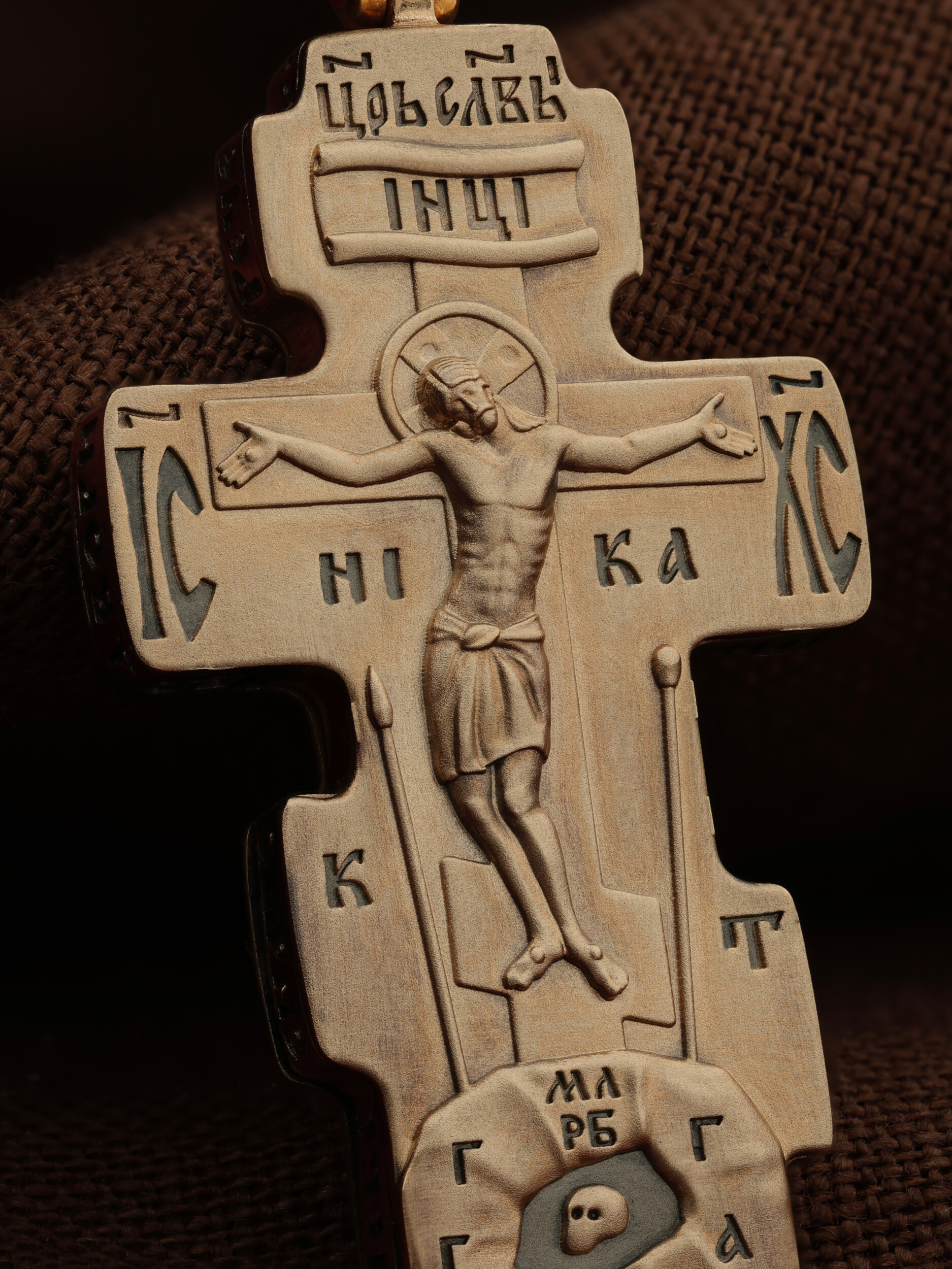На лицевой стороне креста изображено Распятие Господа и Спасителя нашего Иисуса Христа. Крест- символ спасения и искупления рода человеческого, знамение победы над смертью и адом. Иисус Христос, как искупительная жертва освобождения человечества от власти греха, умер крестной смертью и в третий день воскрес. Над вершиной Распятия помещена надпись «Царь Славы». На верхней табличке, выше головы Иисуса, расположена надпись, составленная Понтием Пилатом — «IНЦI». Она означает «Иисус Назорей, Царь Иудейский». Надпись «IC» «ХC», означает Иисус Христос, помещается на разных сторонах поперечной перекладины креста. Под ней помещено слово «НIКА», что означает Победитель. Крест стоит на горе камней, символизирующих Голгофу, которая обозначена надписью «Г Г». В ее основании различается череп — это голова Адама, обозначенный надписью «Г А». Надпись «МЛРБ» — «место лобное рай бысть» означает место лобное стало раем. Вдоль креста изображены орудия Страстей Христовых: копие сотника Лонгина, которым пронзили подреберье мёртвого Иисуса, чтобы убедиться в Его смерти, и трость с губкой, с которой Иисуса напоили уксусом. Они обозначены буквами «К» и «Т».