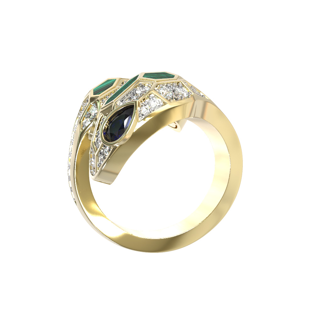 Кольцо из лимонного золота c бриллиантами, сапфиром и малахитом