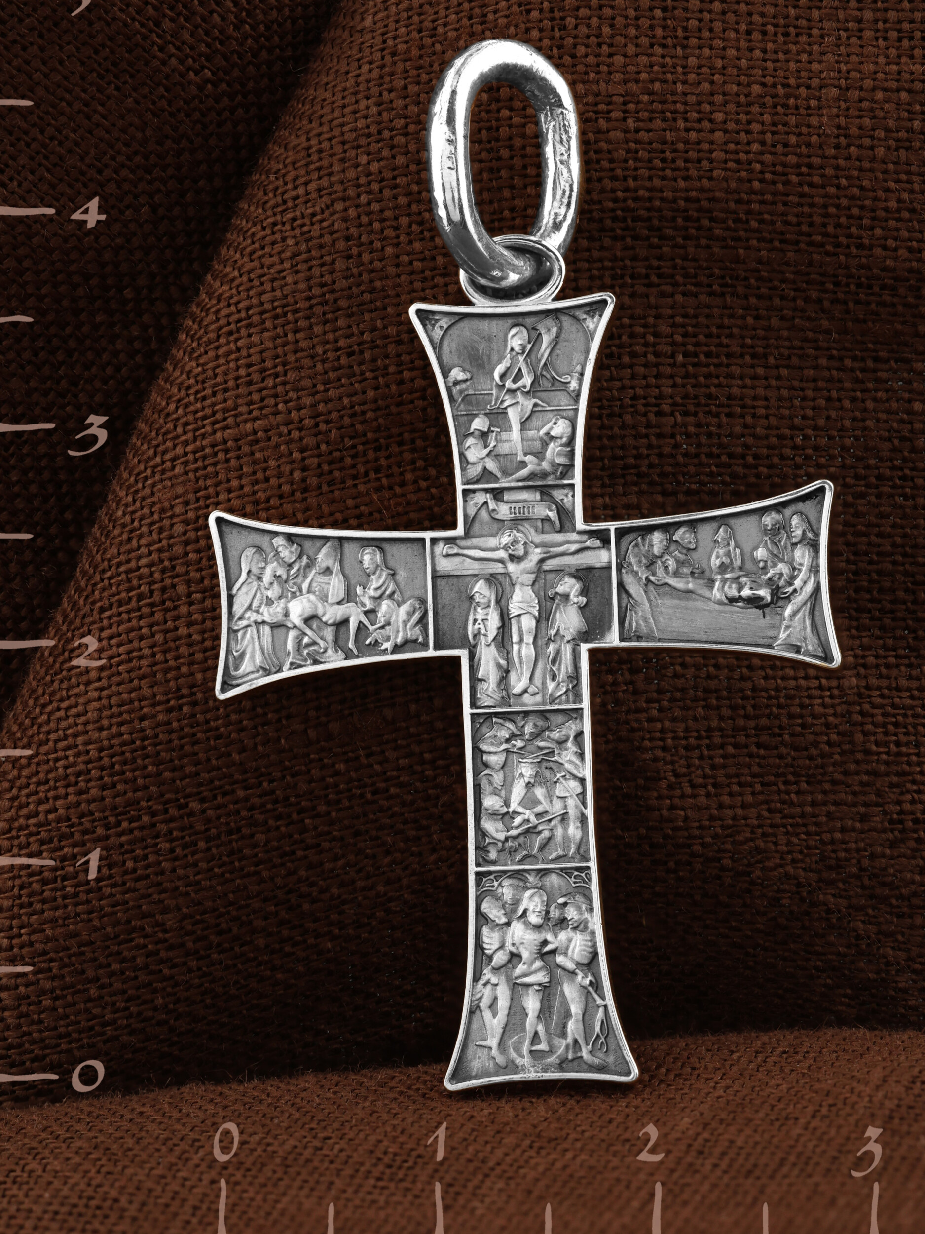 На лицевой стороне креста изображены Крестные Страдания и Воскресение Господа и Спасителя нашего Иисуса Христа. Крест- символ спасения и искупления рода человеческого, знамение победы над смертью и адом. Иисус Христос, как искупительная жертва освобождения человечества от власти греха, умер крестной смертью и в третий день воскрес. В центре креста изображено Распятие Иисуса Христа на Кресте. Ниже — взятие под стражу, а также пытки и мучения Христа перед Распятием. Слева от Распятия изображено снятие Господа с Креста, справа — положение во гроб. Над Распятием отображен образ Воскресшего из гроба Господа и Спасителя нашего Иисуса Христа.