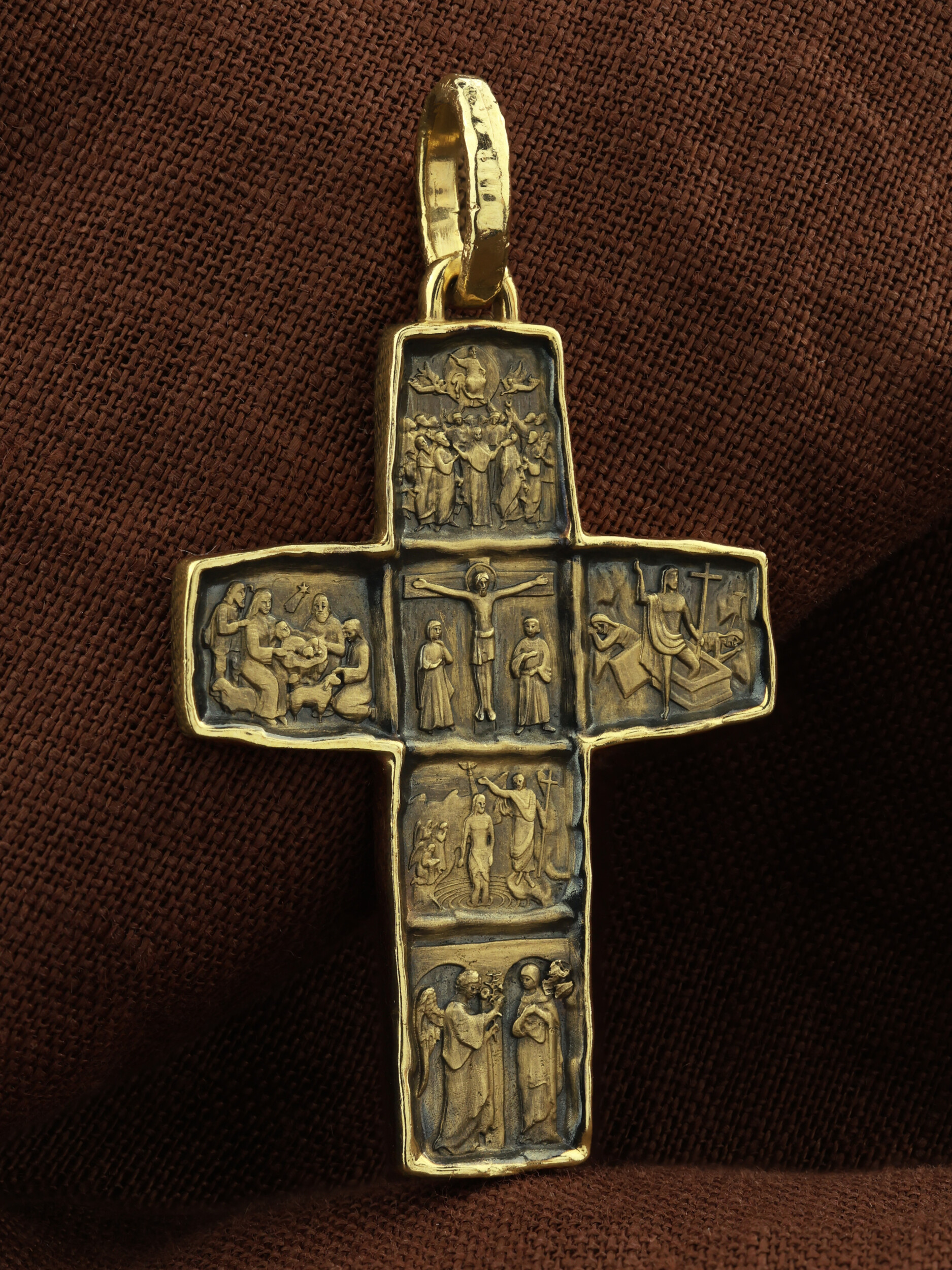 На лицевой стороне креста изображены основные события земной жизни, Крестные Страдания, Воскресение и Вознесение Господа и Спасителя нашего Иисуса Христа. Крест — символ спасения и искупления рода человеческого, знамение победы над смертью и адом. Иисус Христос, как искупительная жертва освобождения человечества от власти греха, умер крестной смертью и в третий день воскрес. В центре креста изображено Распятие Иисуса Христа на Кресте. Ниже Распятия размещено изображение Благовещения Пресвятой Богородицы, а так же Крещение Господне. Слева от Распятия изображено Рождество Господне, справа отображен образ Воскресшего из гроба Господа и Спасителя нашего Иисуса Христа. Над Распятием изображено Вознесение Господне.