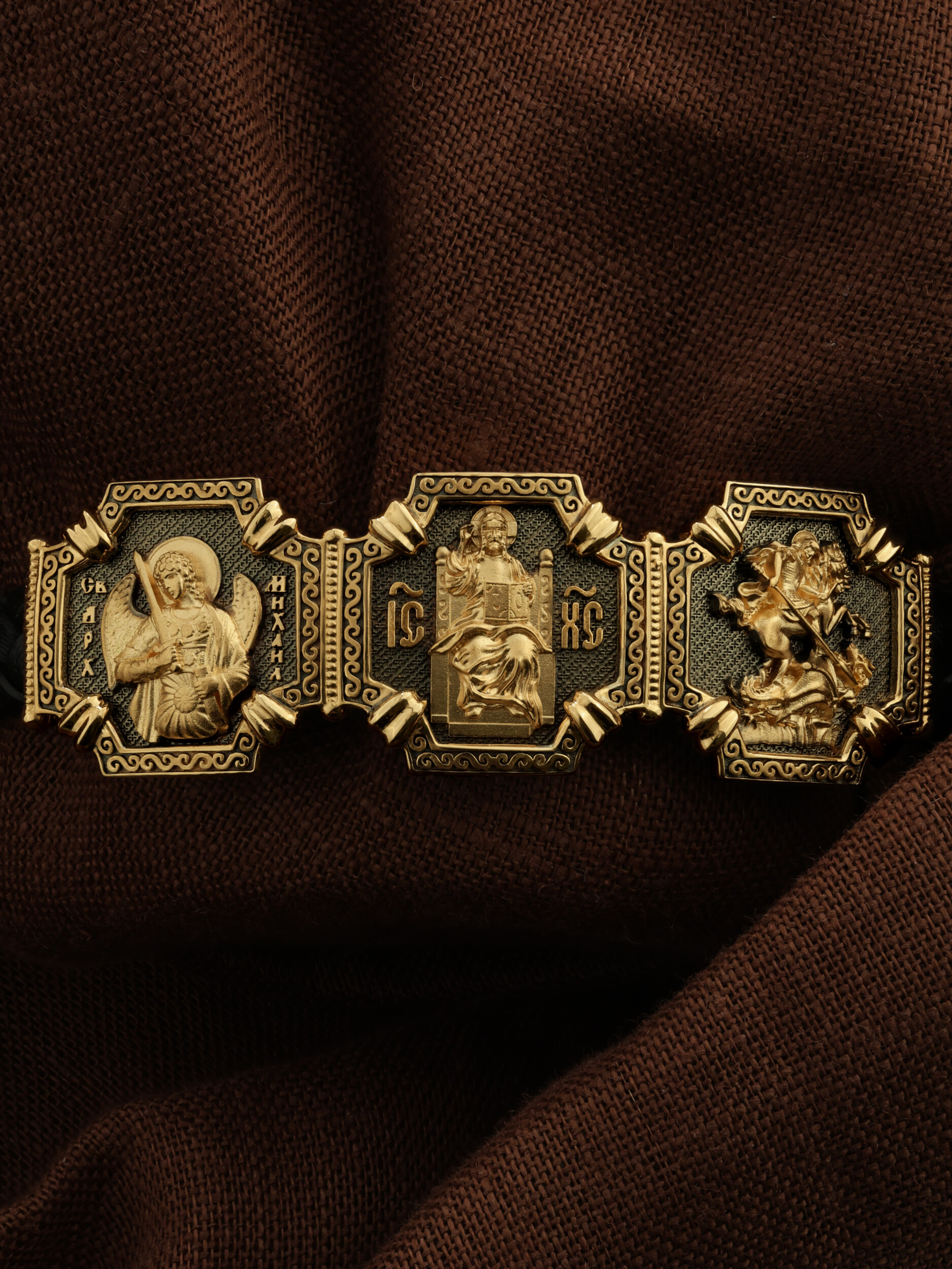 Композиционным центром браслета является Иисус Христос в образе Вседержителя, по-гречески «Пантократор». Это древнейший образ Спасителя, на котором Он представлен как властелин и правитель мира. Христос держит в руках Книгу, которая символизирует Книгу Бытия, то есть весь сотворенный Богом мир. В этой Книге судьбы всех людей, живущих на земле. Слева от образа Вседержителя — икона Архангела Михаила — Архистратига всех Небесных Воинств. Он ведет непримиримую войну против сил зла, охраняет райские врата и защищает души людей. Его имя означает «Кто яко Бог?», так как он самый могучий и грозный враг зла. Он первым ополчился на Денницу, когда тот восстал против Бога, низверг его с Неба и не перестает сражаться с его темным воинством. Поэтому он часто изображается в виде воина, в доспехах и с огненным мечом. Справа от образа Вседержителя — Великомученик Георгий Победоносец. Образ Великомученика считают одним из наиболее чтимых святынь в Святыни Православных, он олицетворяет собой заступника для верующих, чья жизнь имеет какое-либо отношение к военным делам, также он может оберегать и землевладельцев. Одно из самых великих чудес которое сотворил Великомученик так это — спасения всего города от устрашающего змия. Молитвами и своей непреклонной верой, взываемой к Всевышнему, он смог одолеть чудовище. Святой убил змея, спас жителей и их души от влияния дьявола, породив в них надежду и веру в Господа, призывая людей принять христианскую веру. Поскольку при жизни Святой Георгий был военным, он считается покровителем всех, кто имеет отношение к армии — военнослужащим, участникам боевых действий. Молитва перед иконой Георгия Победоносца поможет защититься от врагов, одержать победу в сражении (военном, спортивном, духовной брани с дьяволом), содействие в установлении мир