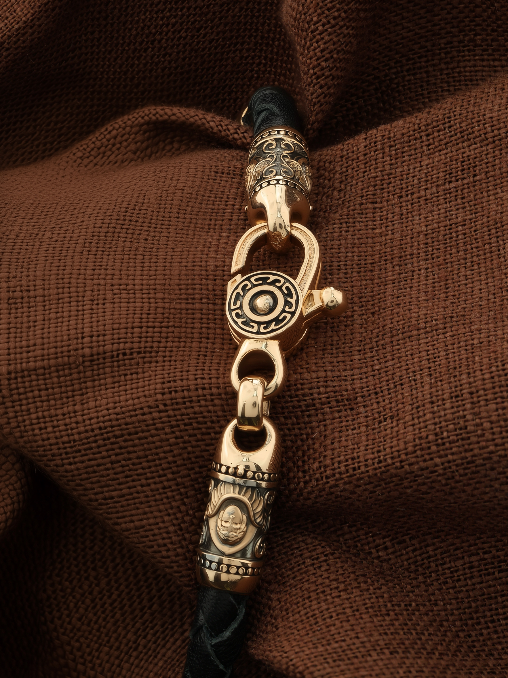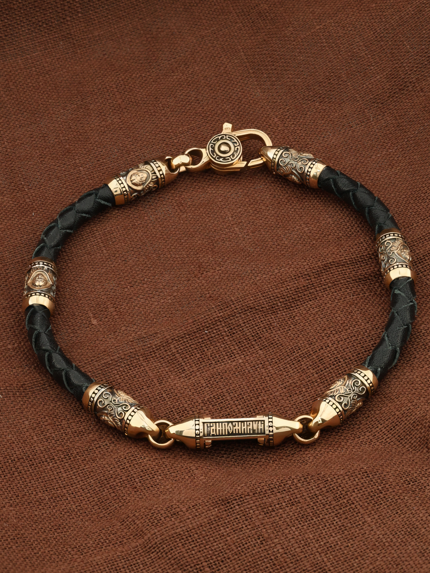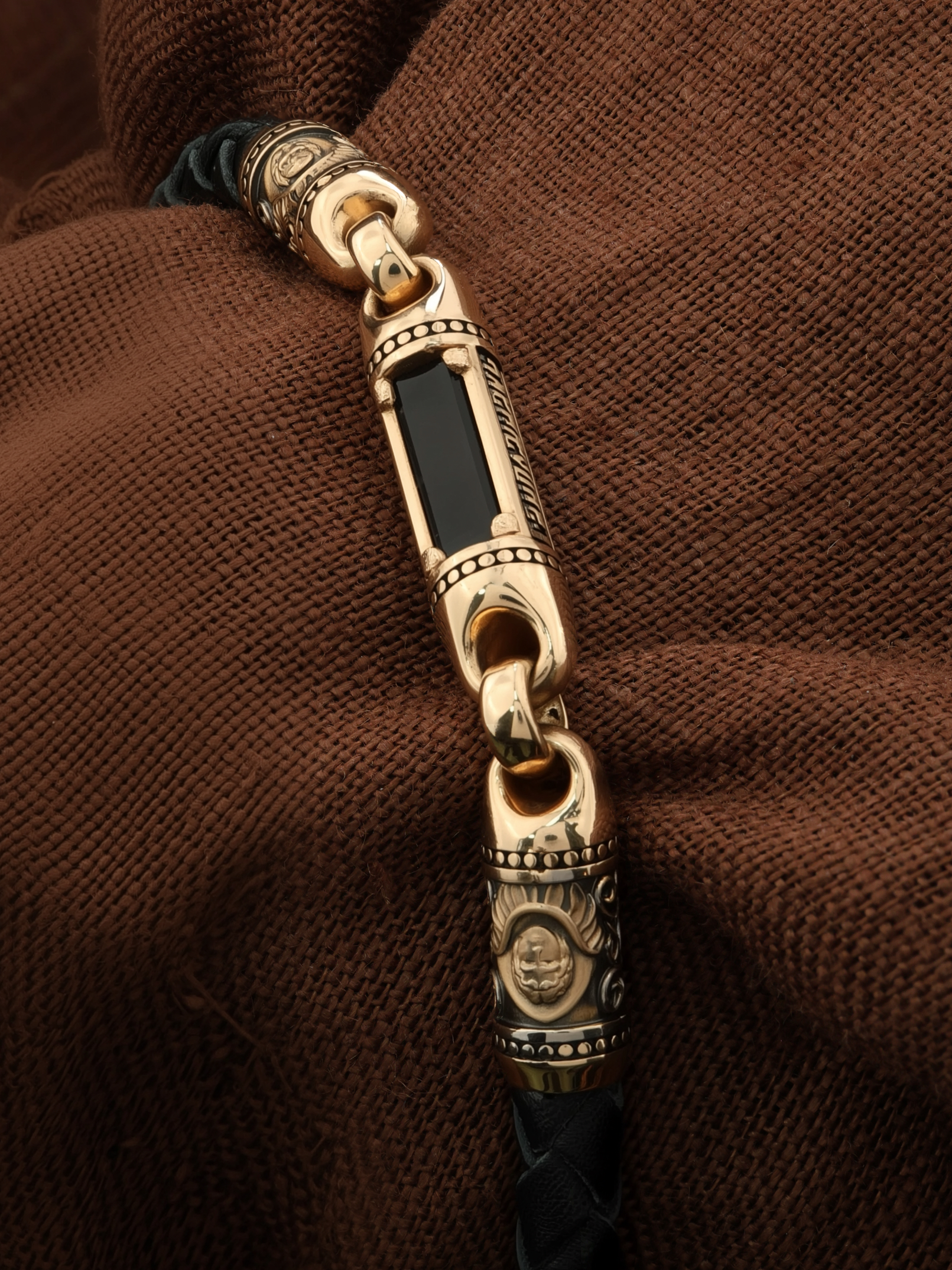 Браслет из золота c кожаным шнурком и ониксом
